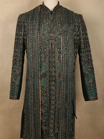 Elevate your traditional wardrobe with this majestic Deep Forest Green Semi Silk Men’s Sherwani Suit, crafted for grand celebrations and wedding occasions. The rich forest green base, infused with subtle emerald undertones, creates a royal and commanding presence that exudes sophistication and heritage charm.