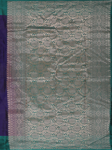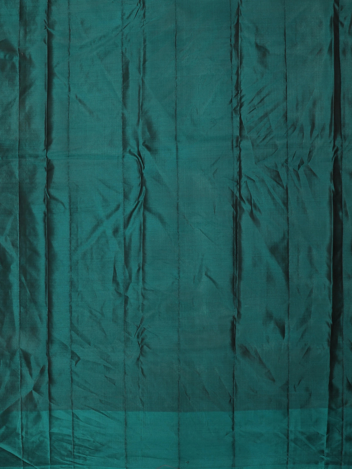 Enhancing its visual appeal is a striking contrast border in a complementary teal green tone, beautifully accented with intricate zari detailing. The contrast pallu and border create a balanced and eye-catching look, lending the saree a festive yet classy charm. The soft silk fabric ensures a smooth, lightweight drape that is comfortable for long hours of wear.