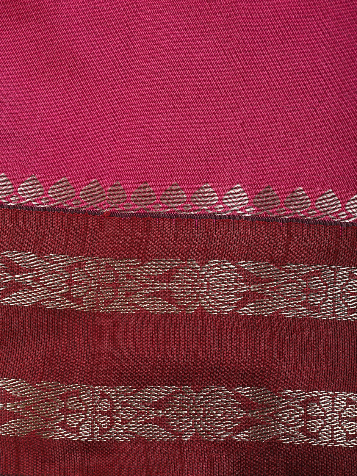 Complementing the solid silk body is a contrast maroon border, delicately woven with subtle silver zari motifs, adding a touch of classic charm without overpowering the minimal design. The soft silk texture ensures a comfortable drape with a gentle sheen, making it ideal for long hours of wear.