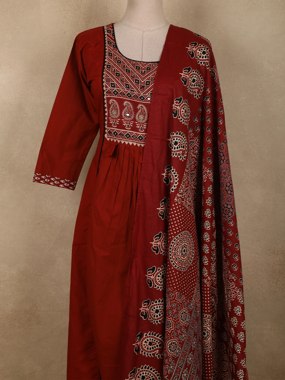 The matching cotton bottom ensures all-day ease, making the ensemble both stylish and practical. Completing the look is a statement Ajrakh printed dupatta, adorned with traditional paisley, floral, and geometric patterns framed by finely detailed borders. Perfect for everyday ethnic wear, office styling, cultural gatherings, and festive daytime occasions, this ensemble offers a refined blend of comfort, tradition, and understated elegance.