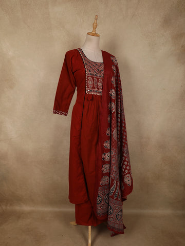 Deep Maroon Ajrakh Printed Design Cotton Salwar Suit with Dupatta