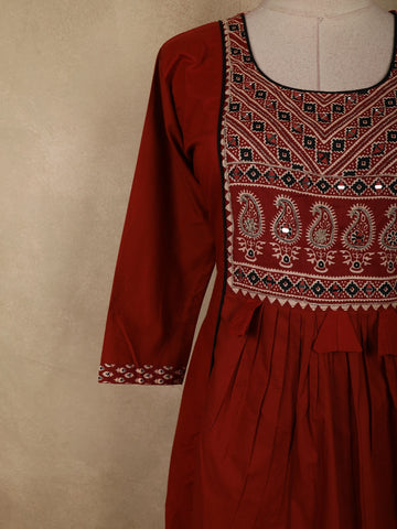This Deep Maroon Ajrakh Printed Cotton Salwar Suit beautifully captures the essence of traditional craftsmanship with its rich earthy tone and heritage-inspired detailing. The kurta features an elegant Ajrakh-style printed yoke, highlighted with intricate floral and geometric motifs in classic ivory and subtle black accents, lending a timeless, handcrafted appeal. Soft pleats below the yoke add graceful movement and comfort, while the three-quarter sleeves are finished with coordinated printed borders.