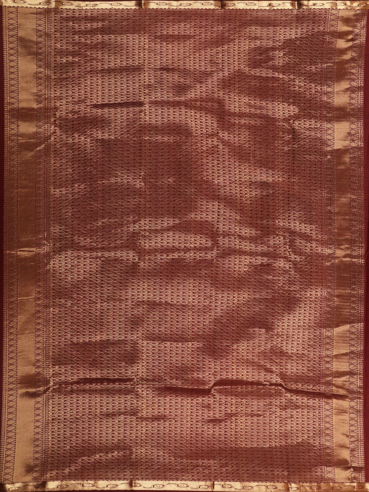 This Deep Maroon Pure Kanchipuram Silk Saree is a timeless embodiment of classic grandeur and traditional artistry. The rich maroon silk body is adorned with finely woven floral butta motifs in antique gold zari, adding a subtle shimmer and elegant texture throughout the drape.