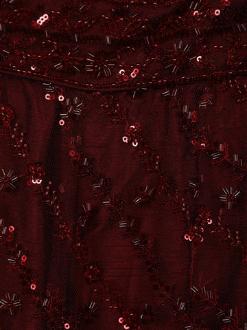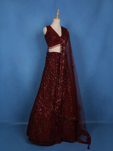 Deep Maroon Floral Sequins Embroidered Net Lehenga Set
