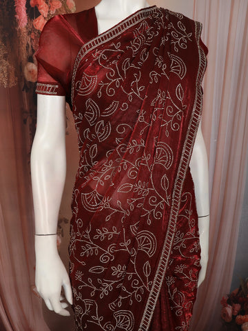 Deep Maroon Floral Vine Stone Embellished Design Satin Fancy Saree with Designer Border