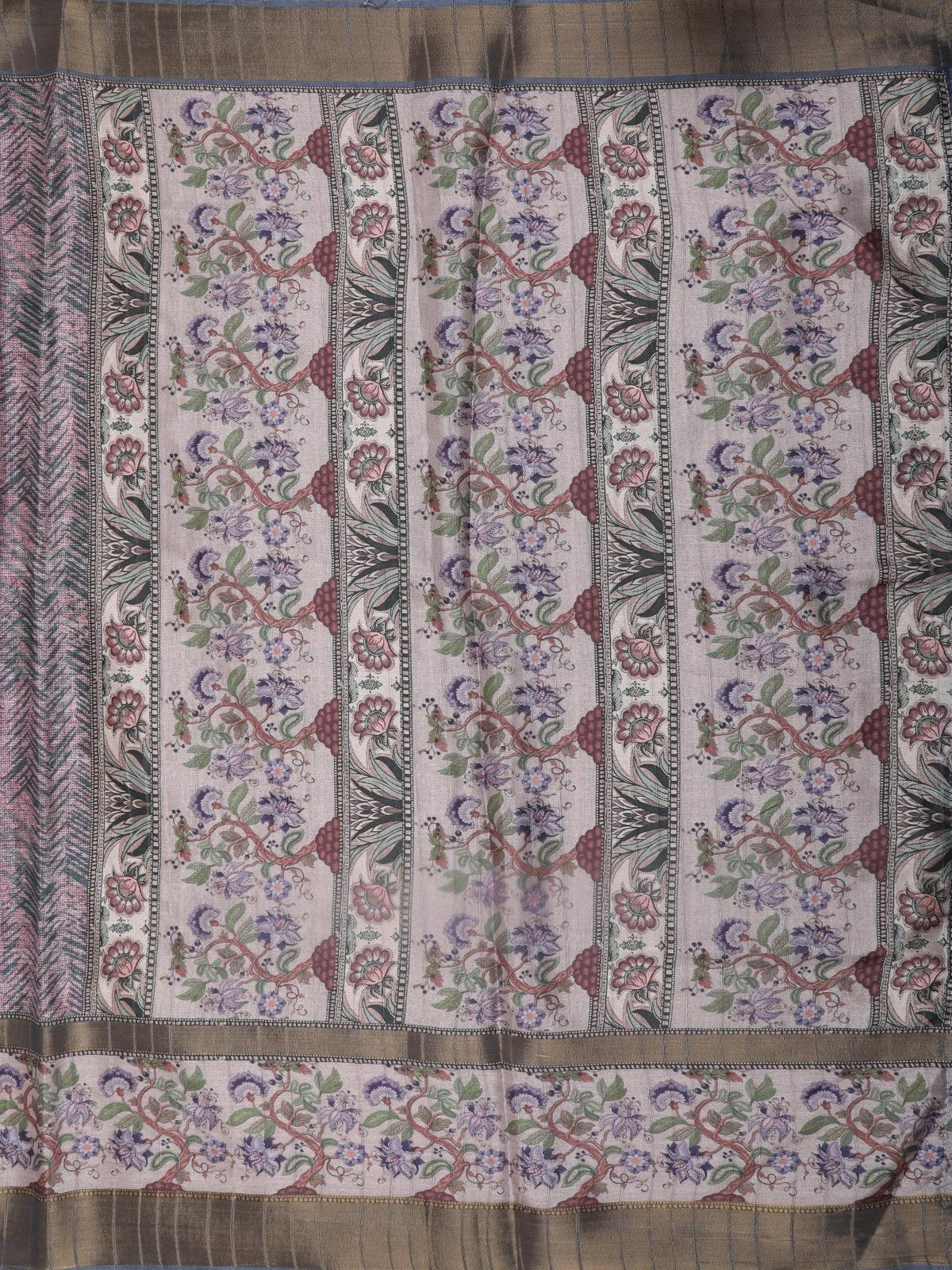 The body of the saree features delicate floral and traditional-inspired prints in muted tones, adding depth and visual interest without overpowering the understated grey base. The serene ash grey shade lends a calm, refined appeal, making it suitable for both everyday elegance and special daytime occasions.
