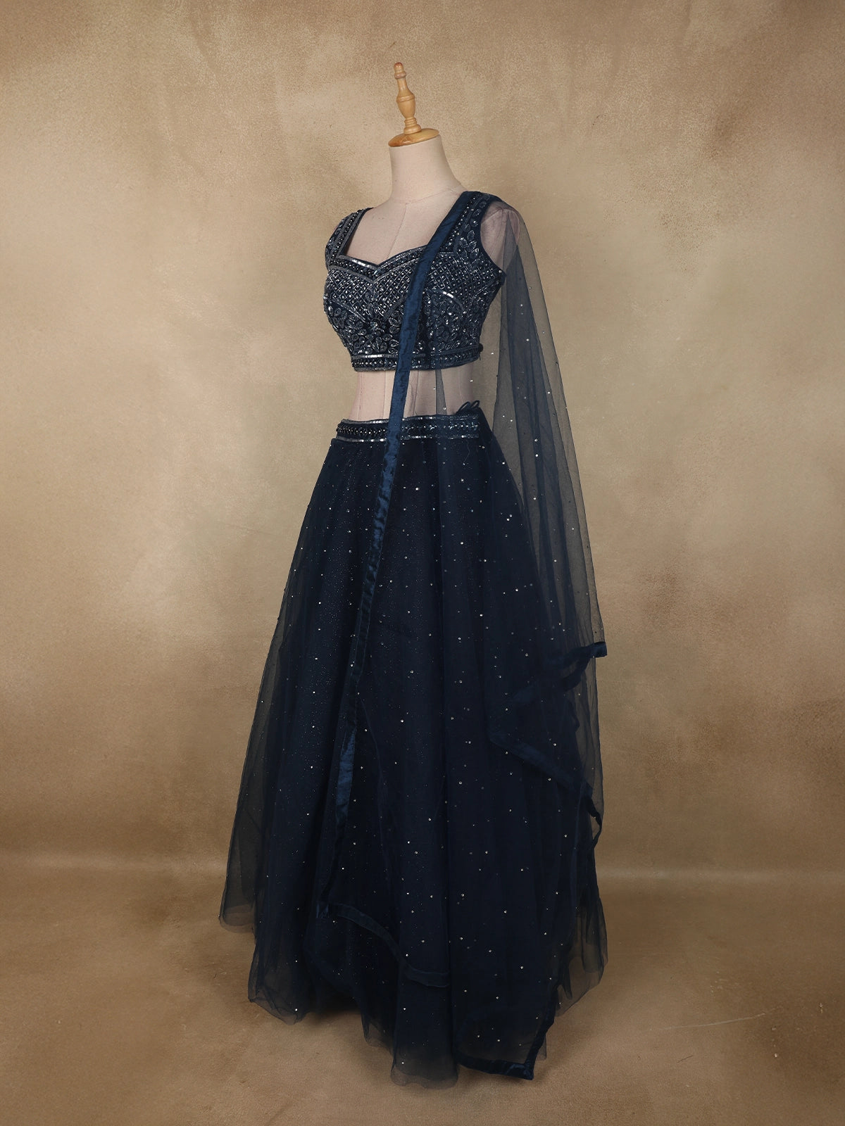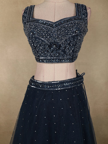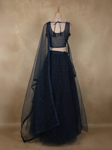 Deep Midnight Blue Sequins and Beads Embroidered Design Net Lehenga With Dupatta