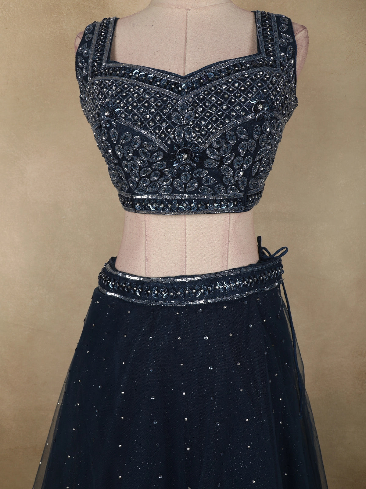 The lehenga skirt is exquisitely embellished with intricate sequin and bead embroidery, delicately scattered across the net base to create a subtle, star-like shimmer. The embellishments catch the light beautifully, adding dimension and texture without overpowering the richness of the black. A finely detailed waistband and softly flared hemline enhance the lehenga’s graceful movement and refined finish.