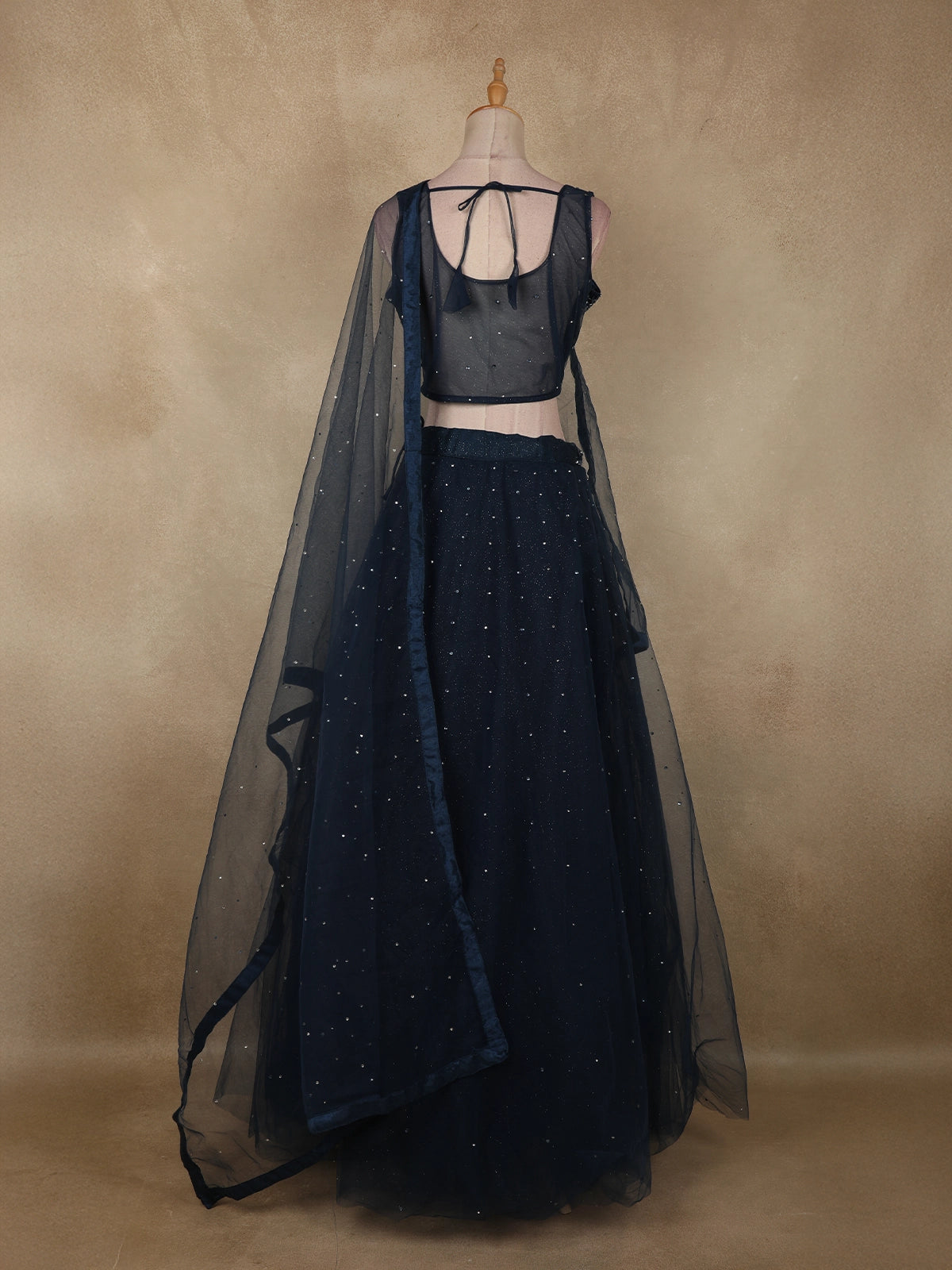 Bold, elegant, and effortlessly glamorous, this lehenga is crafted in a deep midnight blue net, a timeless shade that exudes confidence and modern sophistication. The sheer net fabric creates a fluid, airy silhouette while enhancing the dramatic depth of the black tone, making it perfect for evening celebrations and statement occasions.