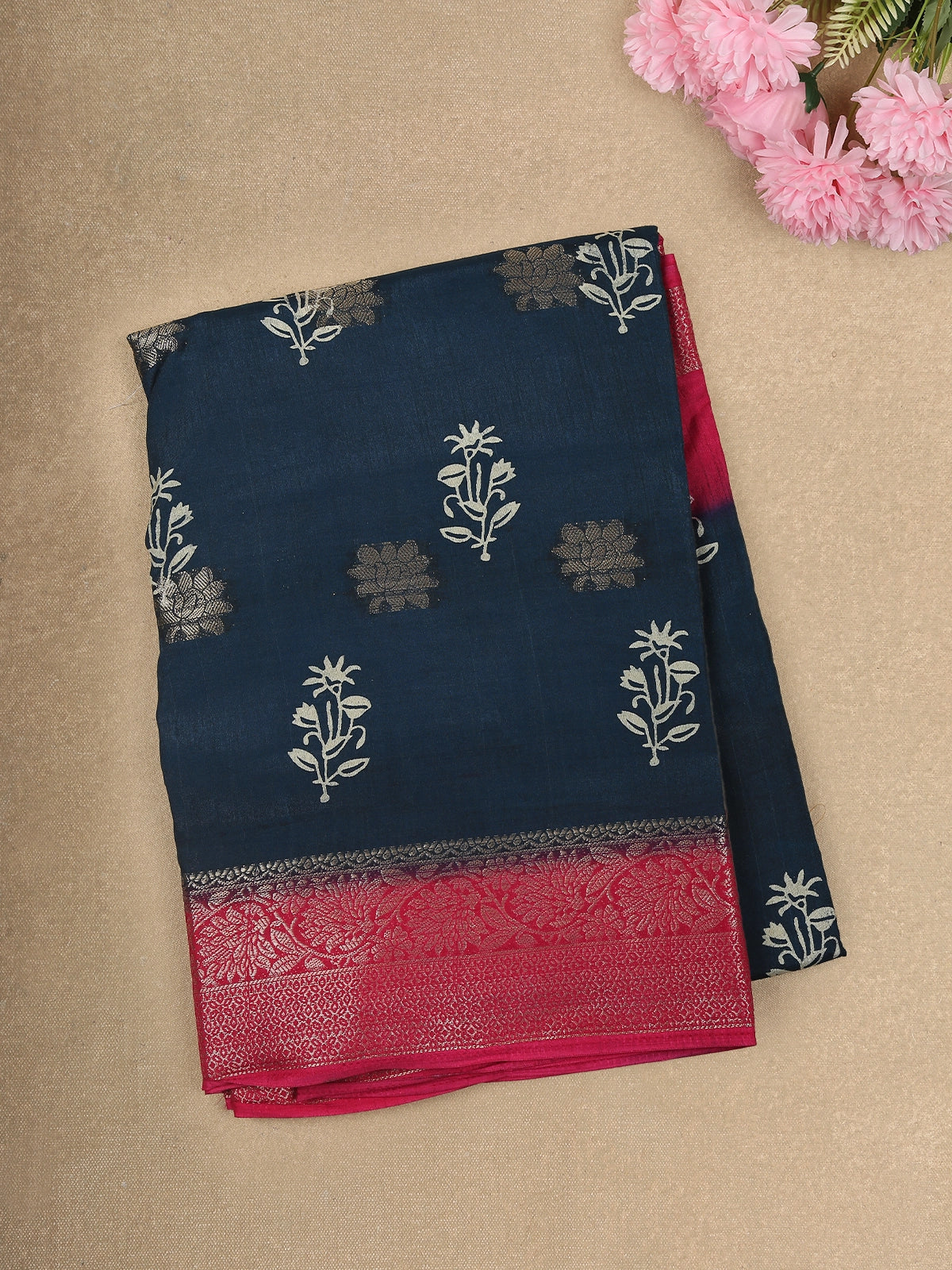 Deep Midnight Navy Blue Floral Butta Printed Design Mixed Cotton Saree with Contrast Zari Border