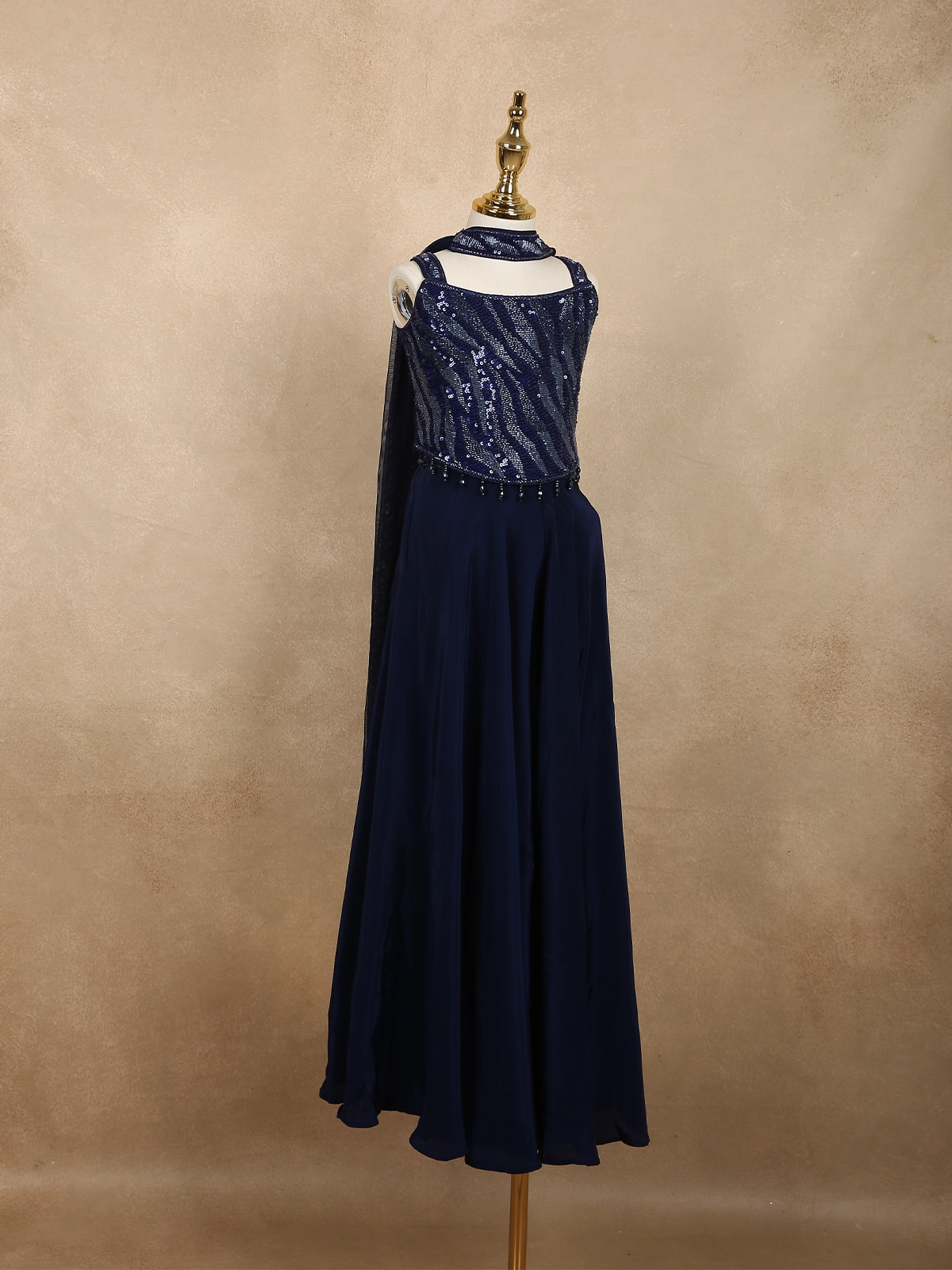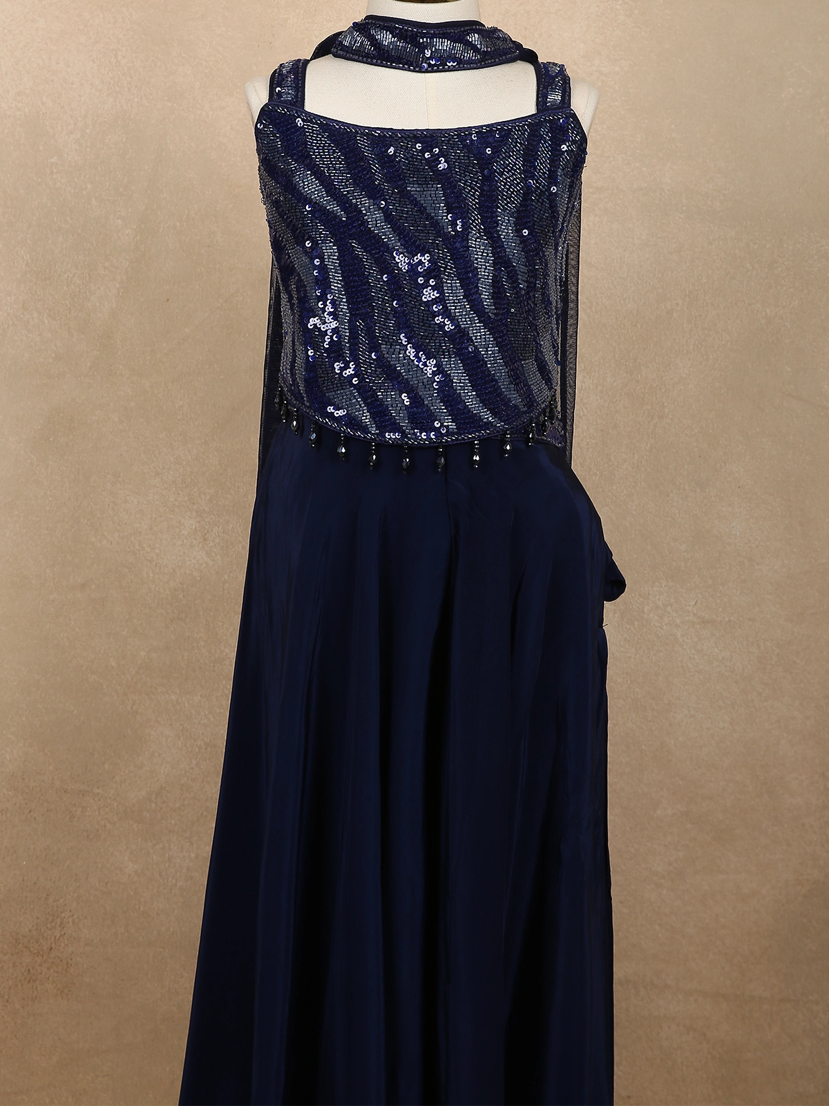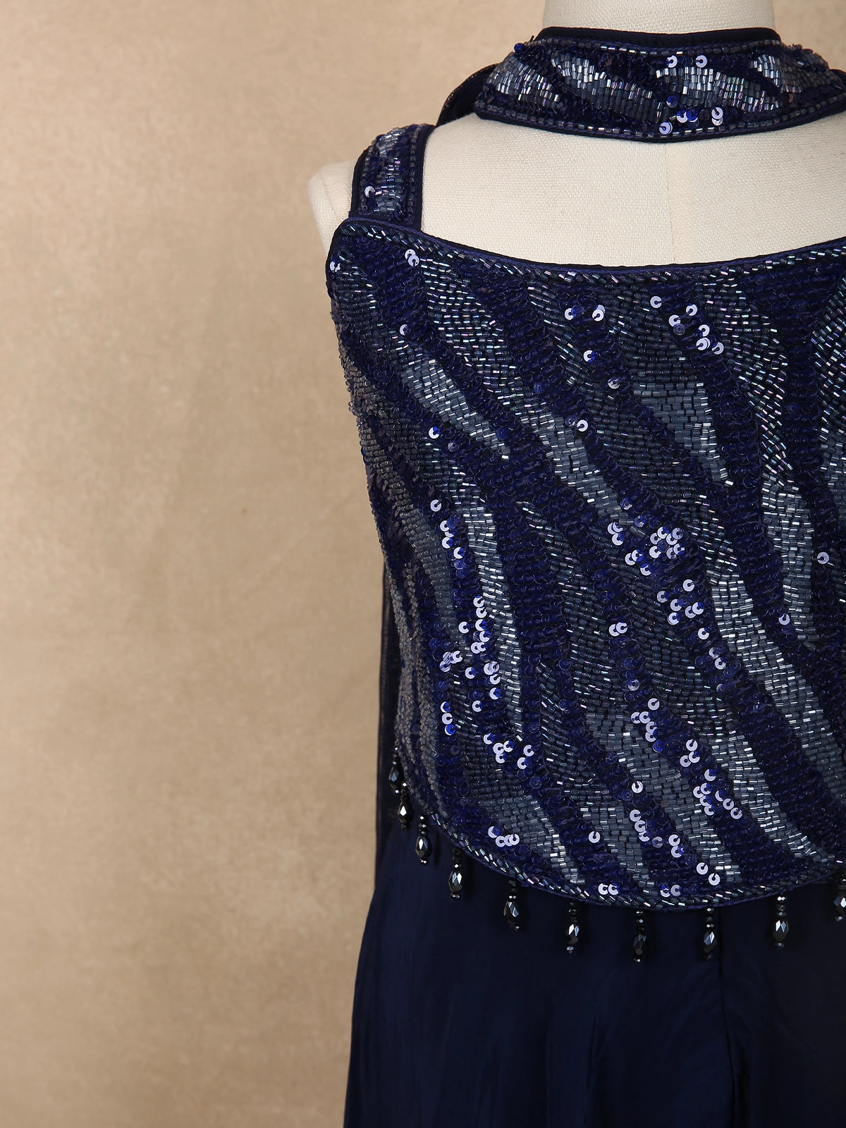 Deep Midnight Navy Blue Sequins Design Satin Kids Palazzo Suit with Dupatta