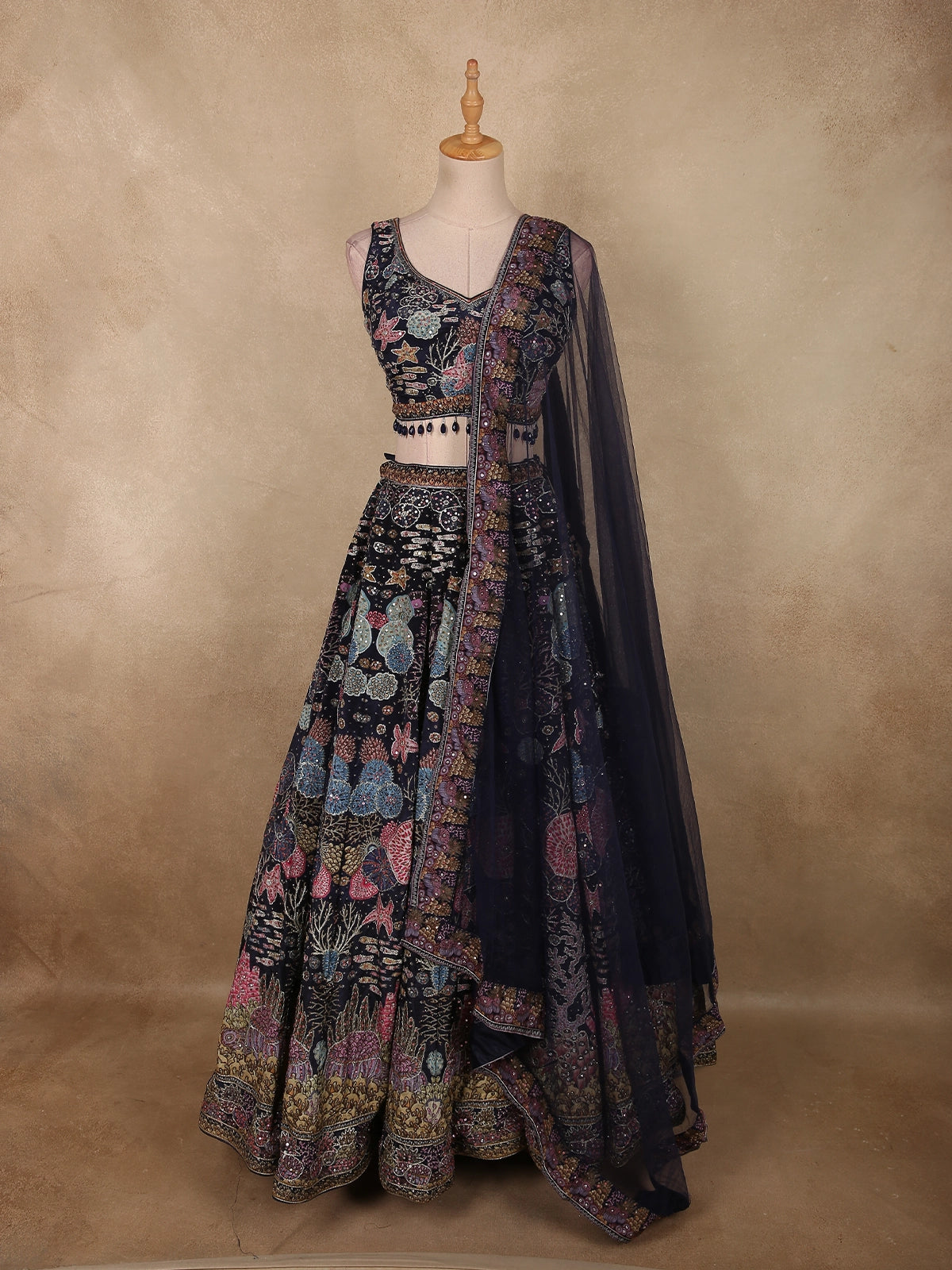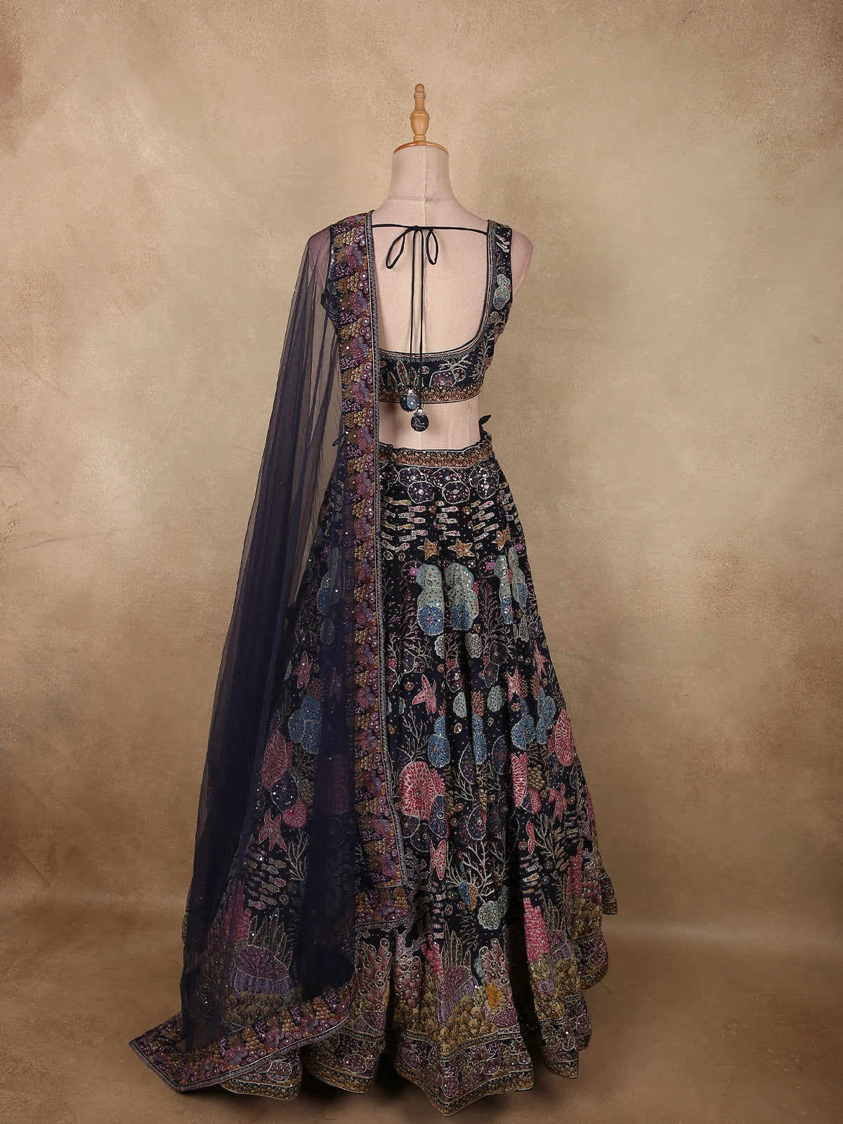 Completing the set is a sheer net dupatta, softly draped and finished with an intricately embellished border that perfectly complements the lehenga. Its lightweight flow adds elegance and balance to the heavily worked ensemble.