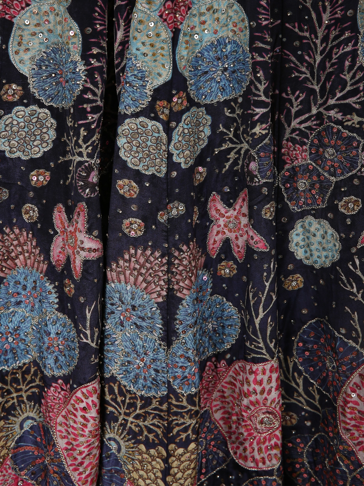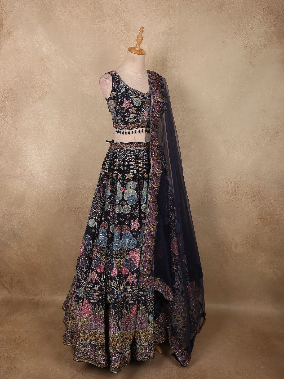 The lehenga skirt features a beautifully structured flare, adorned with detailed embroidery panels that add depth, rhythm, and visual interest. The interplay of metallic accents and multitone highlights enhances the richness without overpowering the silhouette, making it refined yet eye-catching.