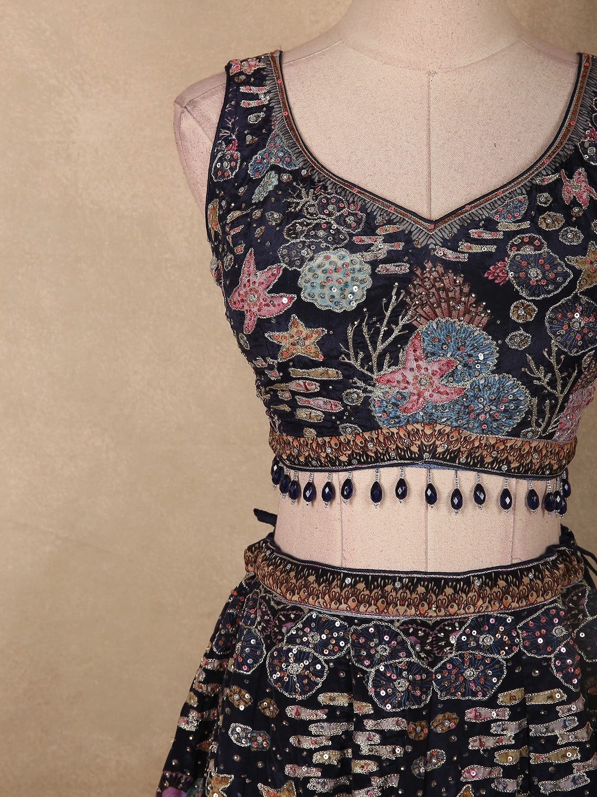Paired with a sleeveless, V-neck embroidered blouse, the ensemble offers a flattering and modern fit. The blouse mirrors the lehenga’s detailing, creating a cohesive and polished look, while delicate bead accents along the waistline add a graceful finishing touch.