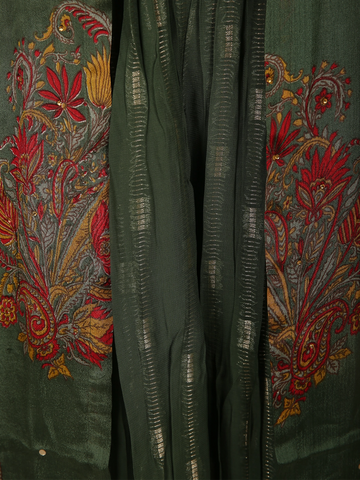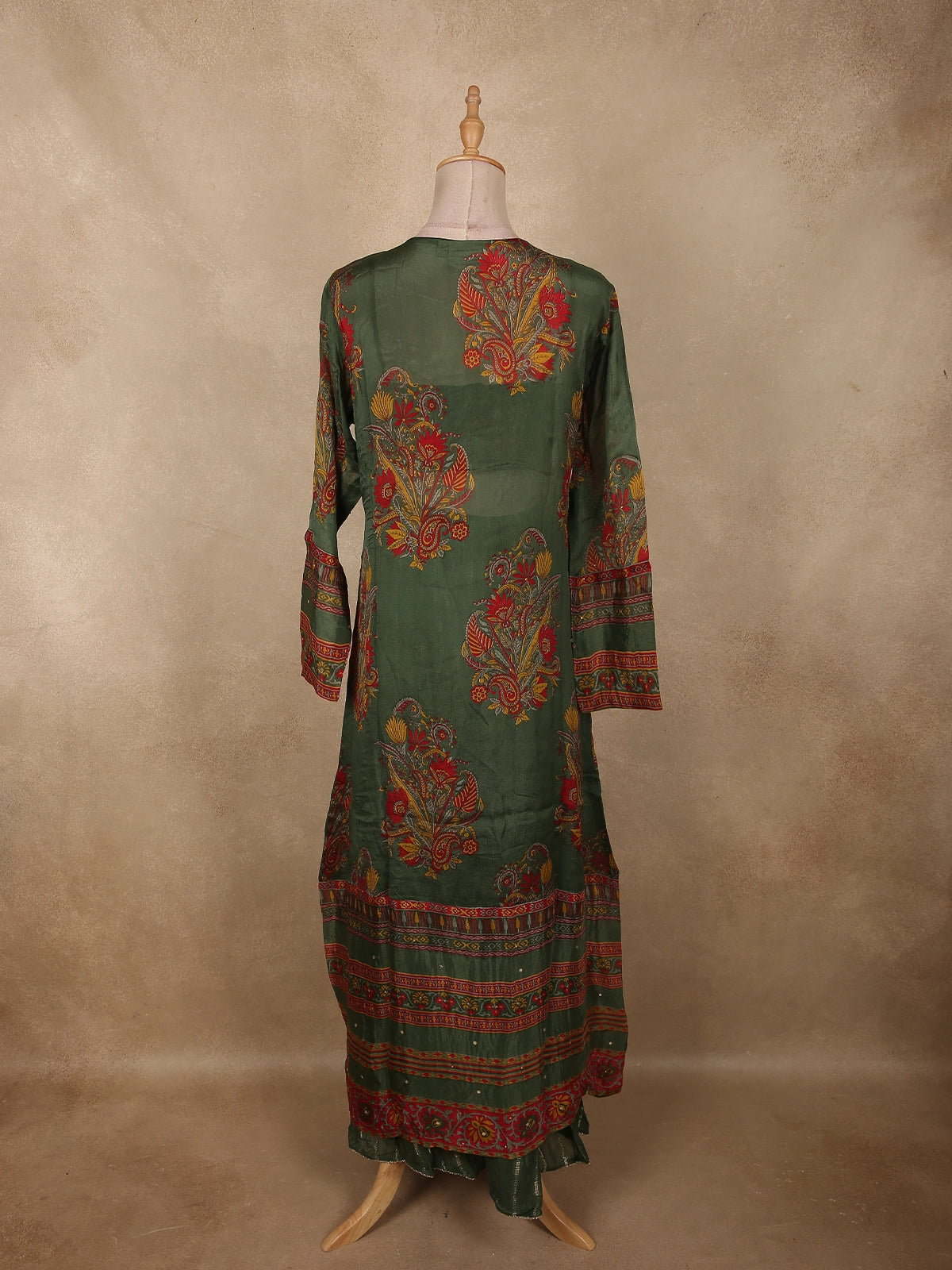 This Deep Olive Green Paisley Printed Design Georgette Palazzo Suit with Long Coat is a bold statement of elegance infused with bohemian ethnic charm. The ensemble features a beautifully printed inner top highlighted with intricate paisley and ethnic-inspired motifs, enriched with subtle embellishment accents that add depth and texture to the design.