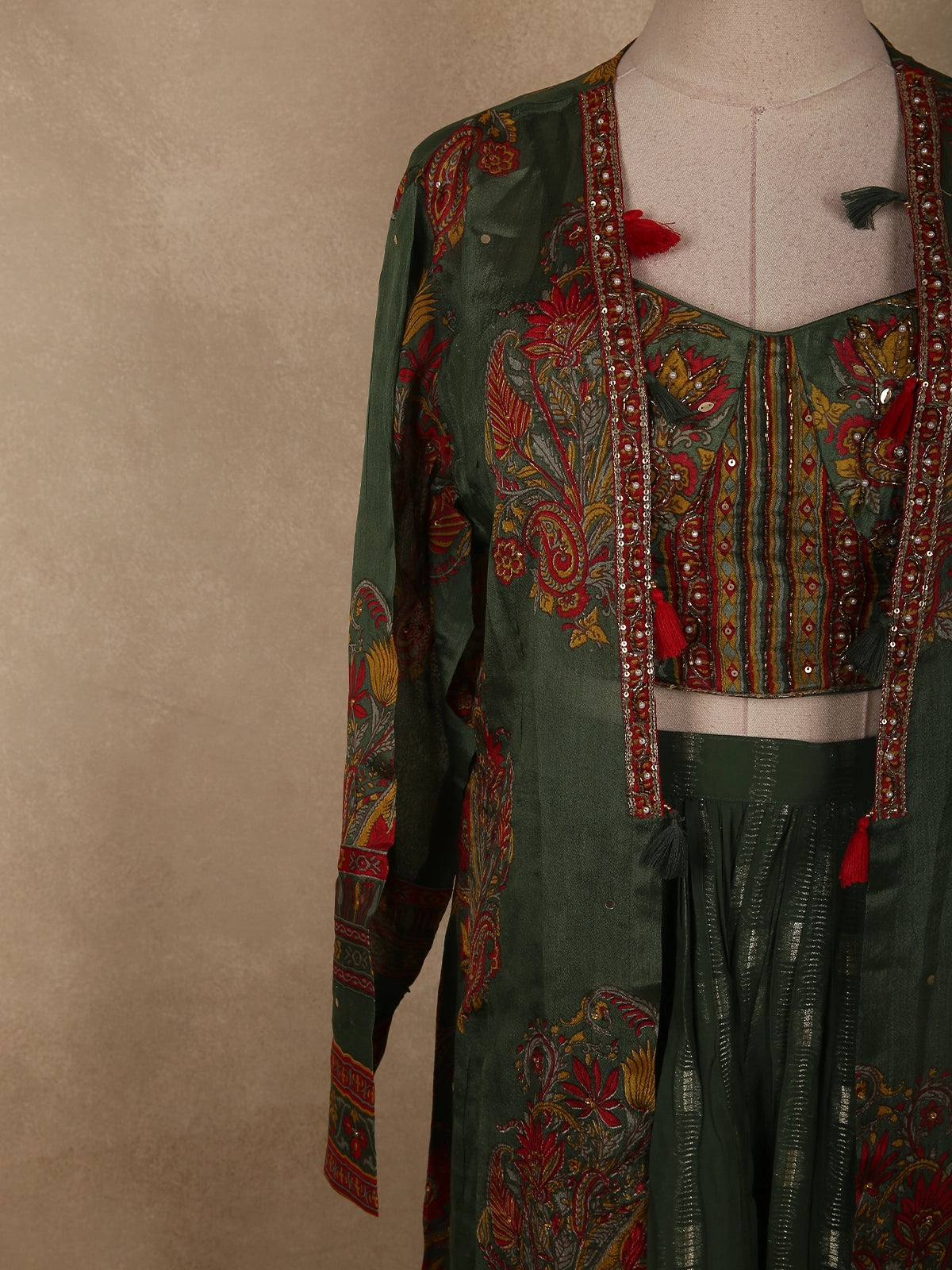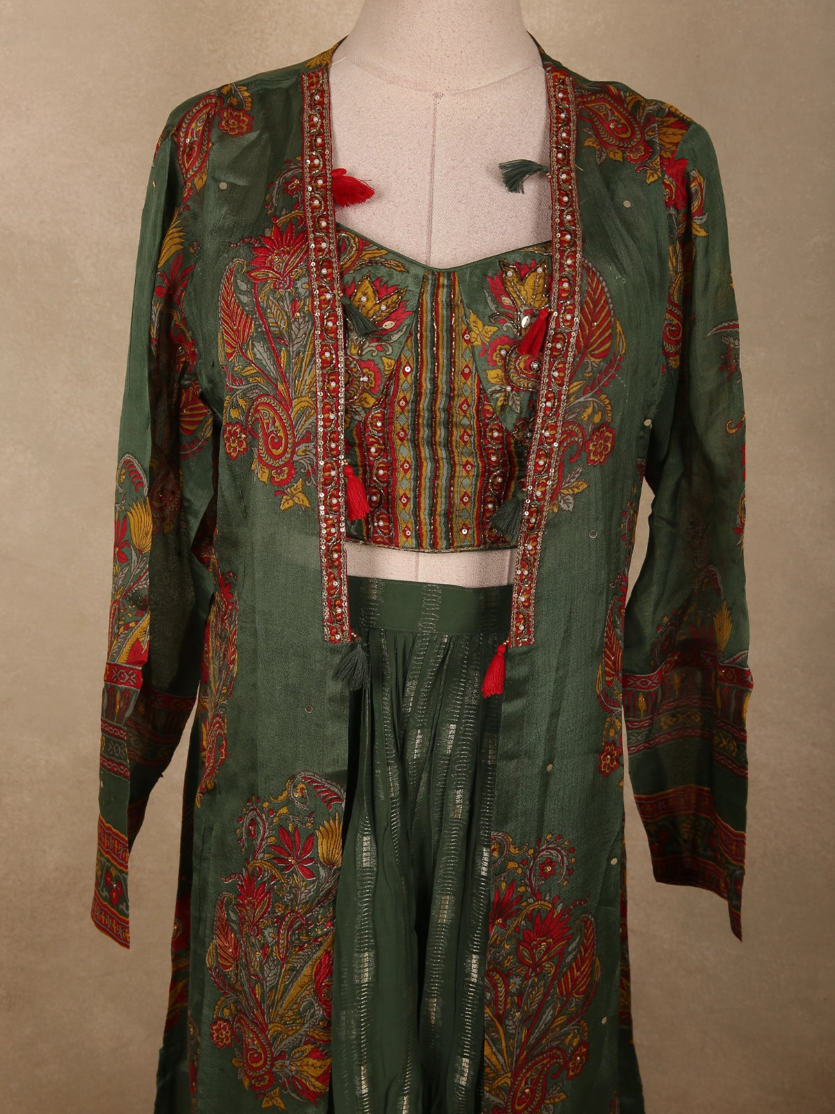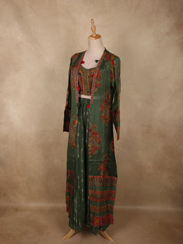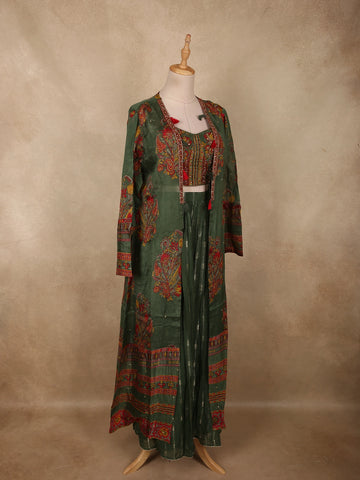 The flowing georgette palazzo pants in a rich charcoal green shade create a graceful silhouette, offering both comfort and sophistication. Layered over the set is a matching long coat crafted in lightweight georgette, adorned with striking paisley prints and detailed ethnic borders along the sleeves, front, and hemline. These intricate borders frame the outfit beautifully, enhancing its visual appeal while maintaining a refined finish.