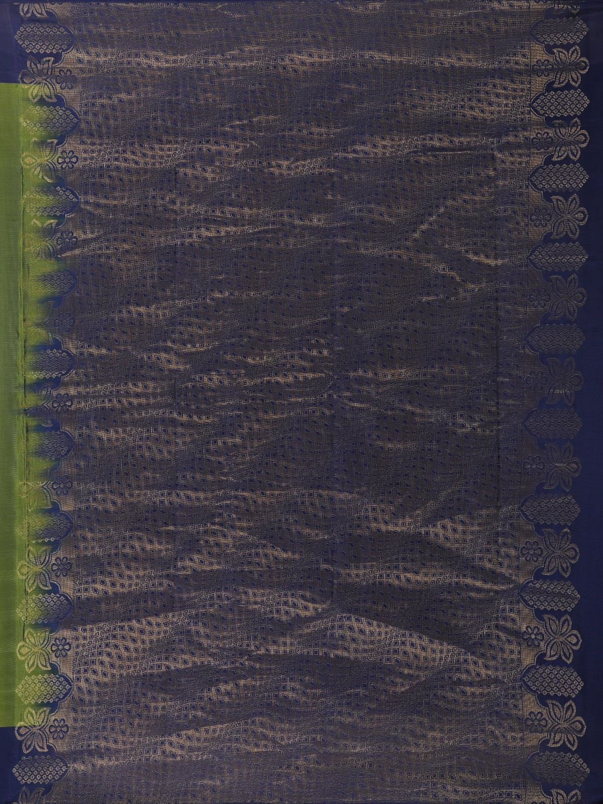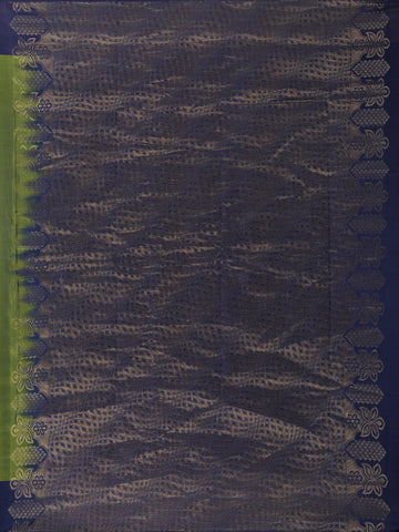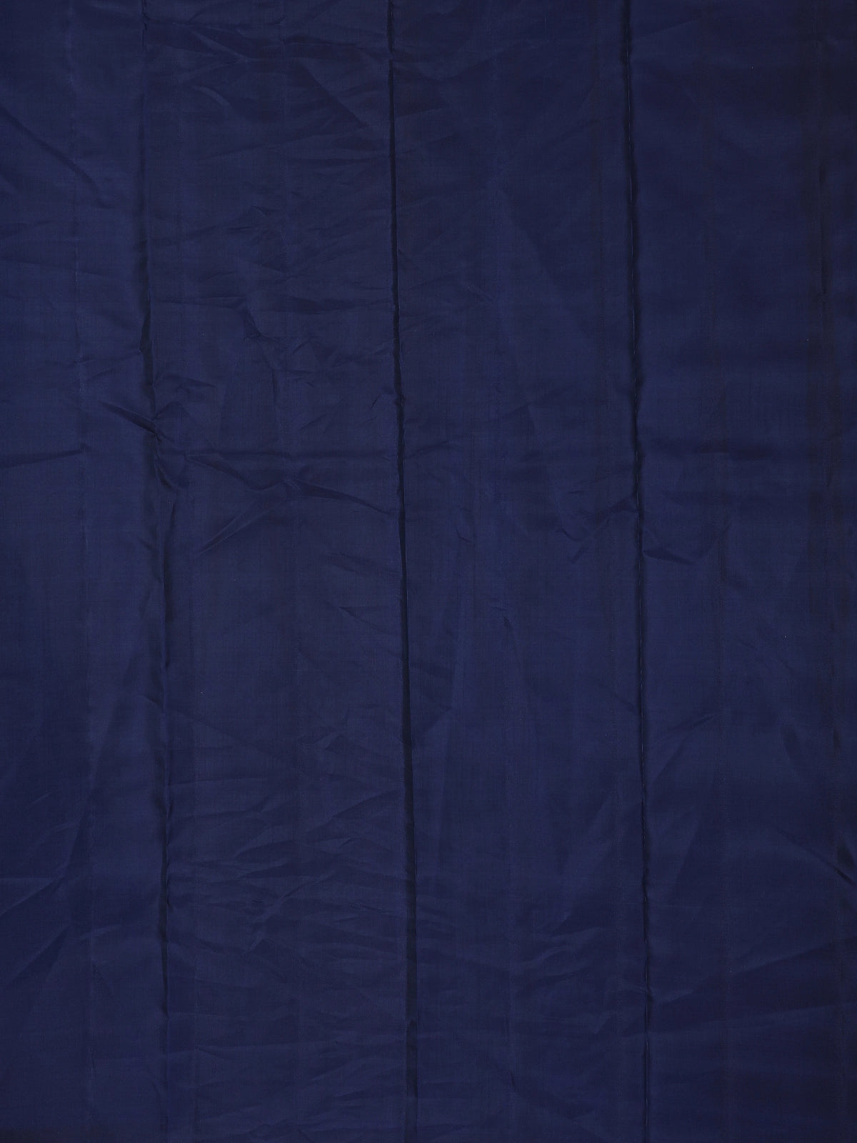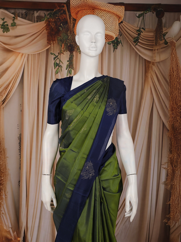 The saree is beautifully complemented by a contrast deep navy blue border, adding a striking visual balance and a classic South Indian touch. Subtle woven motifs scattered across the body lend depth and texture without overpowering the solid design, making it a versatile choice for weddings, poojas, cultural gatherings, and formal celebrations.