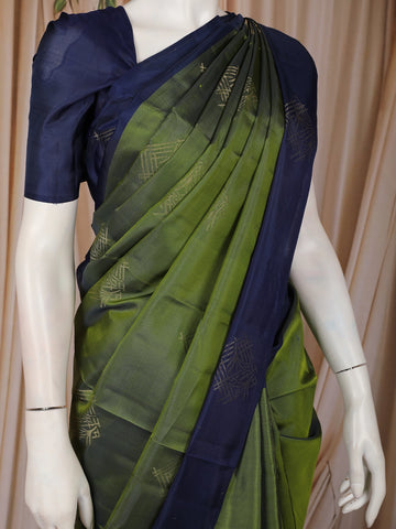 Drape yourself in timeless sophistication with this Deep Olive Green Butta Design Soft Silk Saree, a perfect blend of understated elegance and traditional charm. The rich olive green base carries a refined, earthy tone that exudes grace, making it ideal for both festive occasions and elegant daytime functions. Crafted in smooth soft silk, the saree offers a gentle sheen and fluid drape that enhances comfort while maintaining a luxurious appeal.