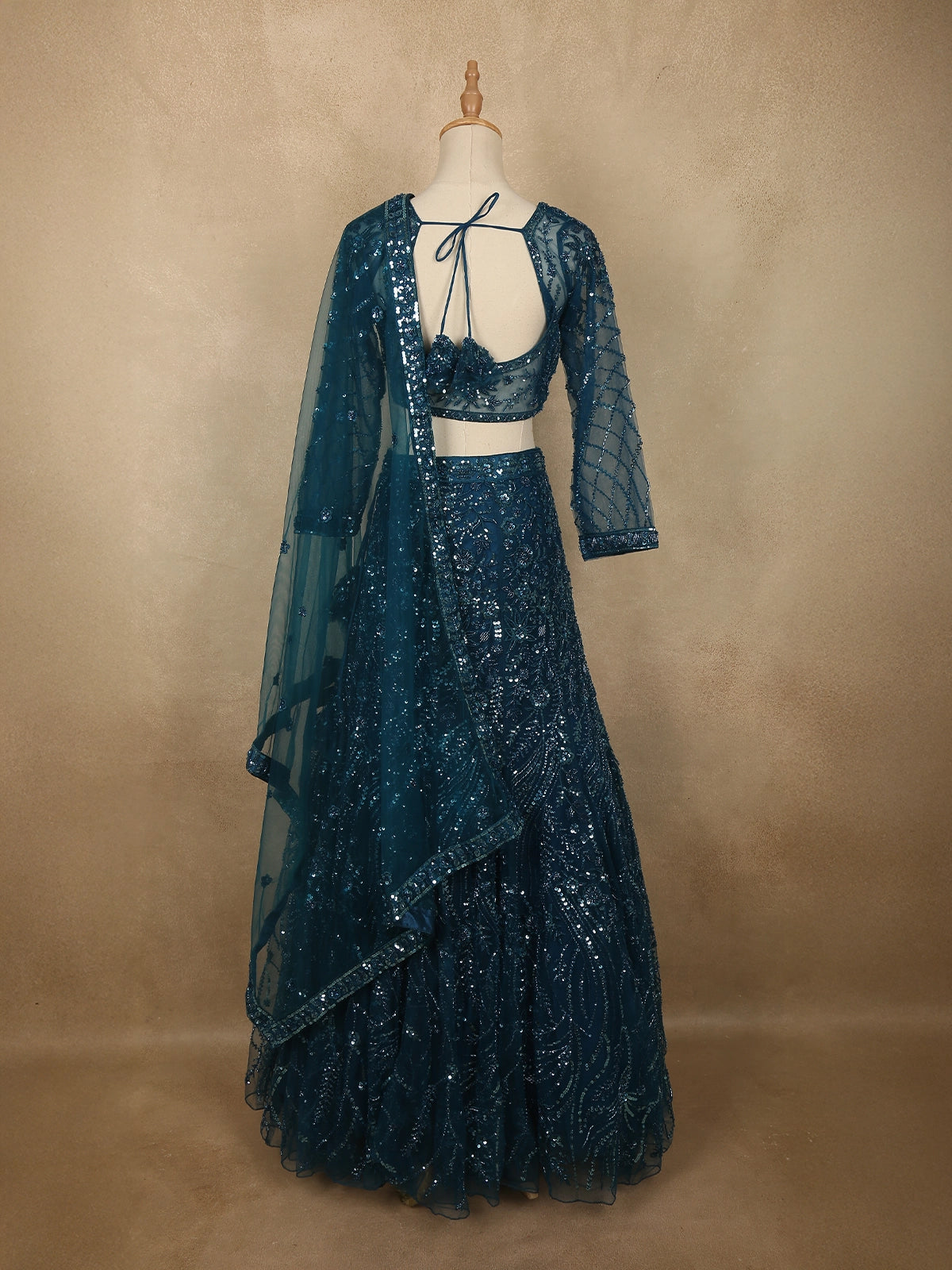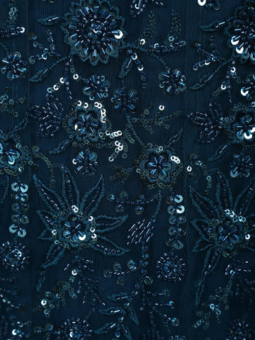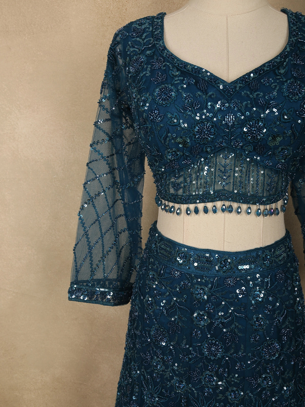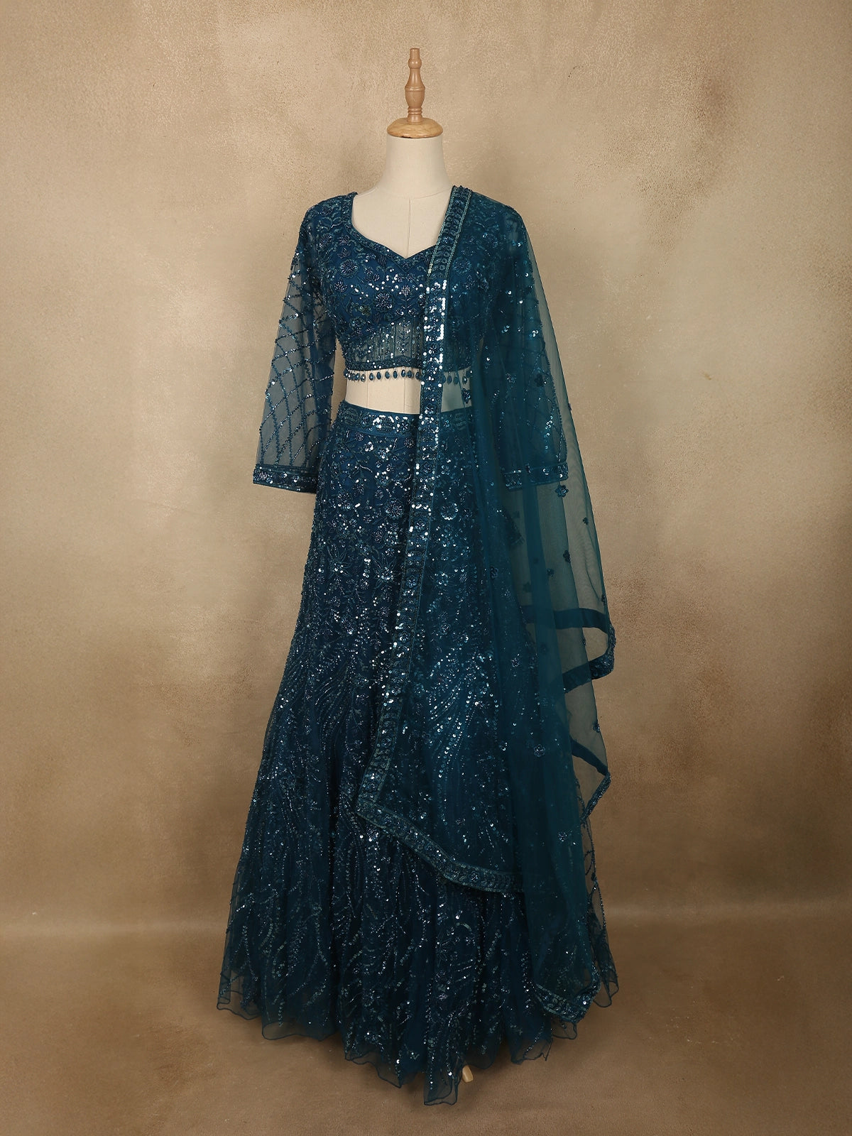 Gracefully blending modern glamour with intricate craftsmanship, this deep peacock teal blue mermaid lehenga ensemble is designed to make a stunning impression at special occasions. Crafted from premium net fabric, the outfit is richly embellished with floral sequins and delicate bead embroidery, creating a captivating shimmer that enhances the depth and elegance of the luxurious teal hue.