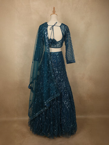 Deep Peacock Teal Blue Floral Sequins and Beads Embroidered Design Net Mermaid Lehenga with Dupatta