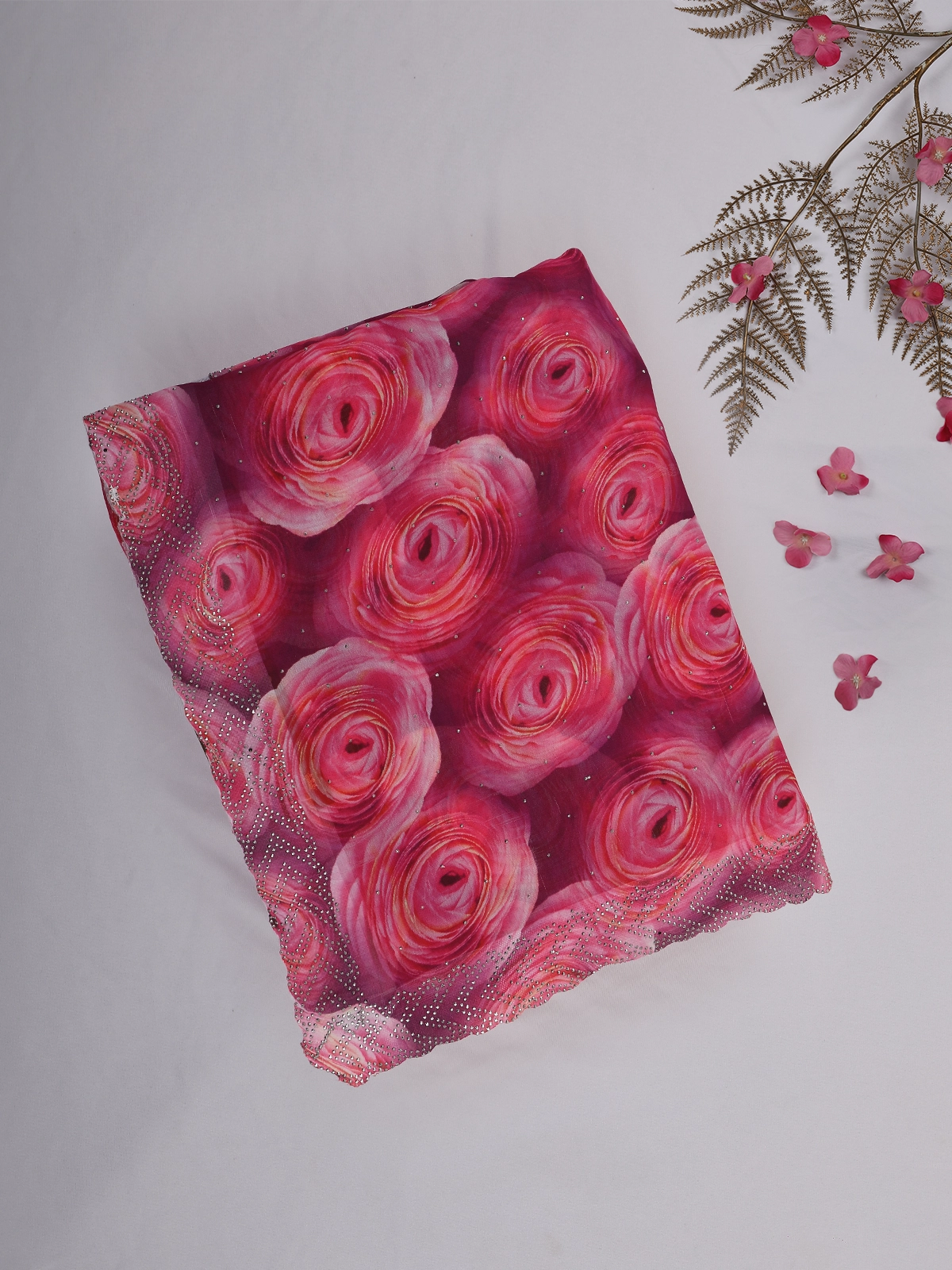 Celebrate bold elegance with this stunning Deep Pink Floral Printed Chiffon Saree, a perfect blend of vibrant colour and graceful charm. The saree features beautifully detailed rose motifs in rich shades of deep pink, fuchsia, and soft blush tones, creating a captivating visual depth reminiscent of blooming garden roses.
