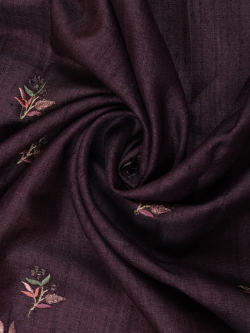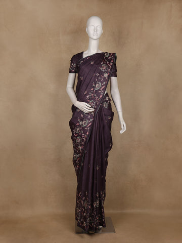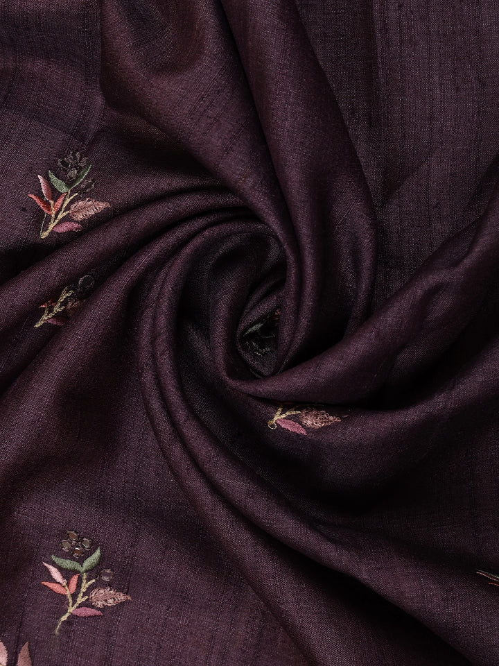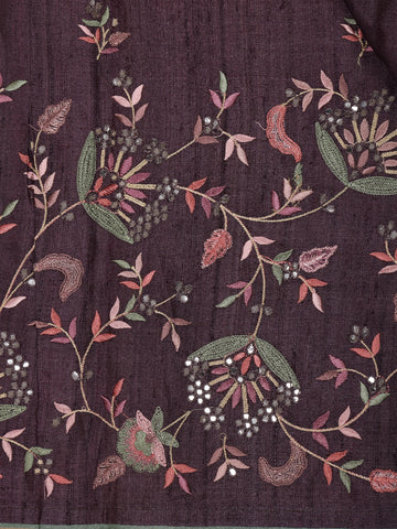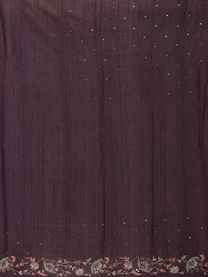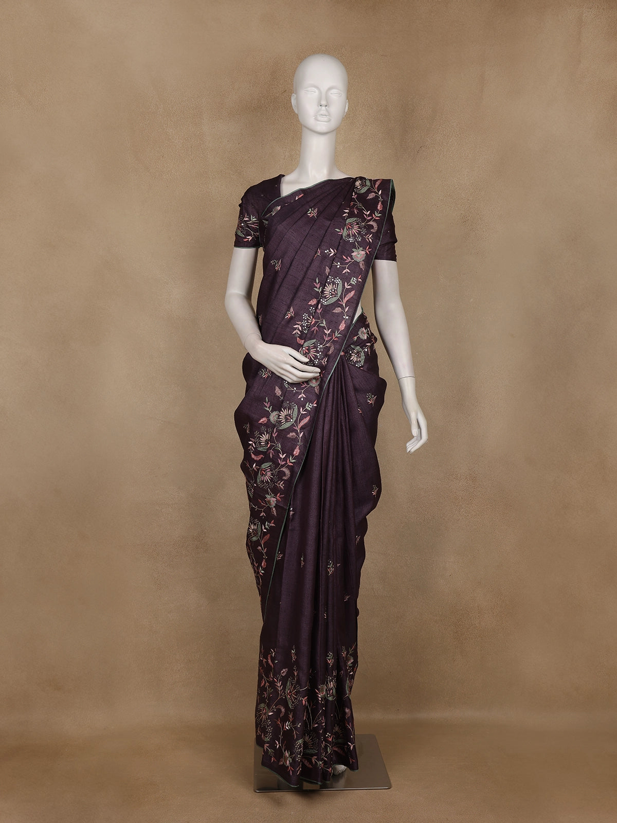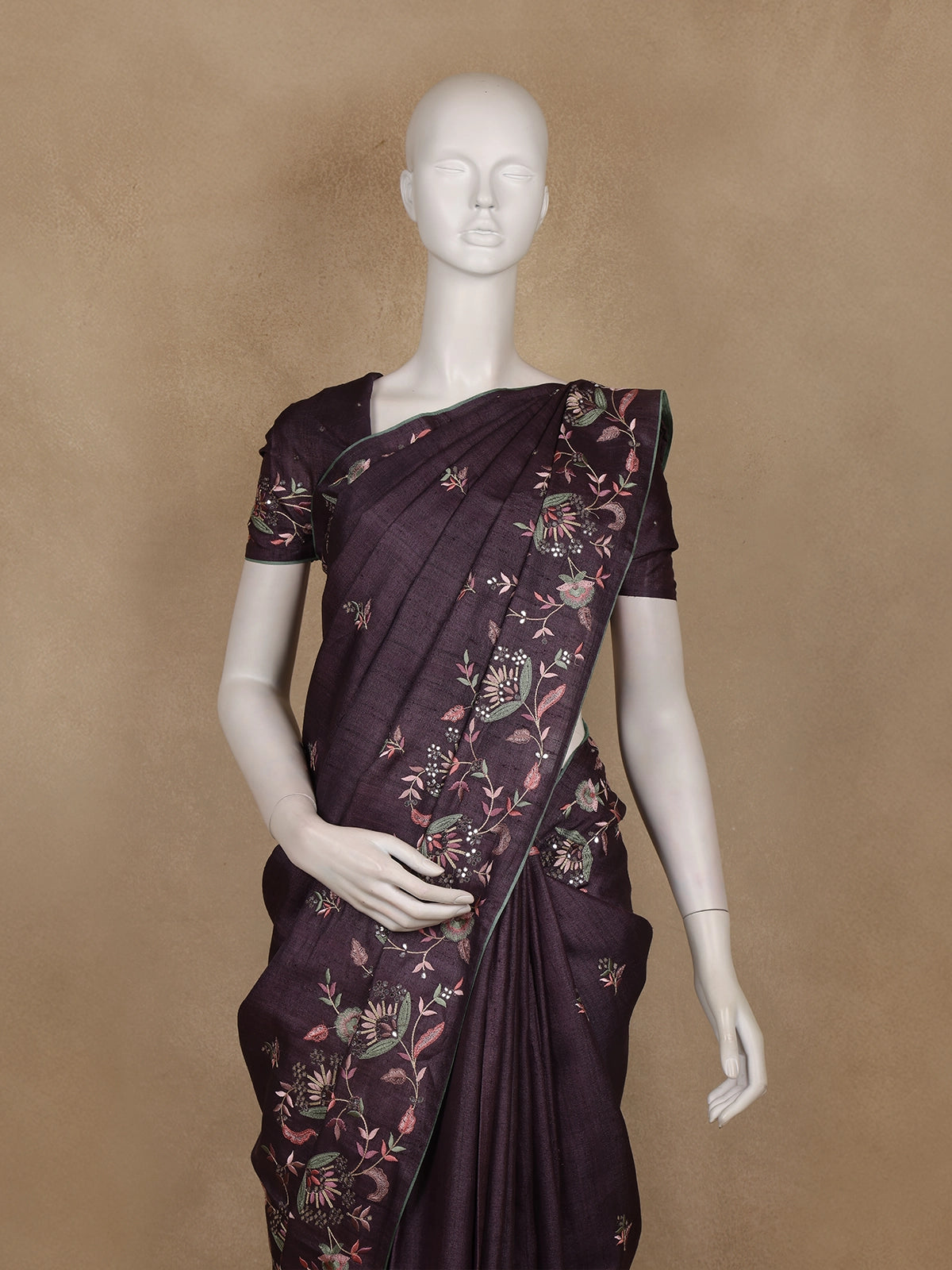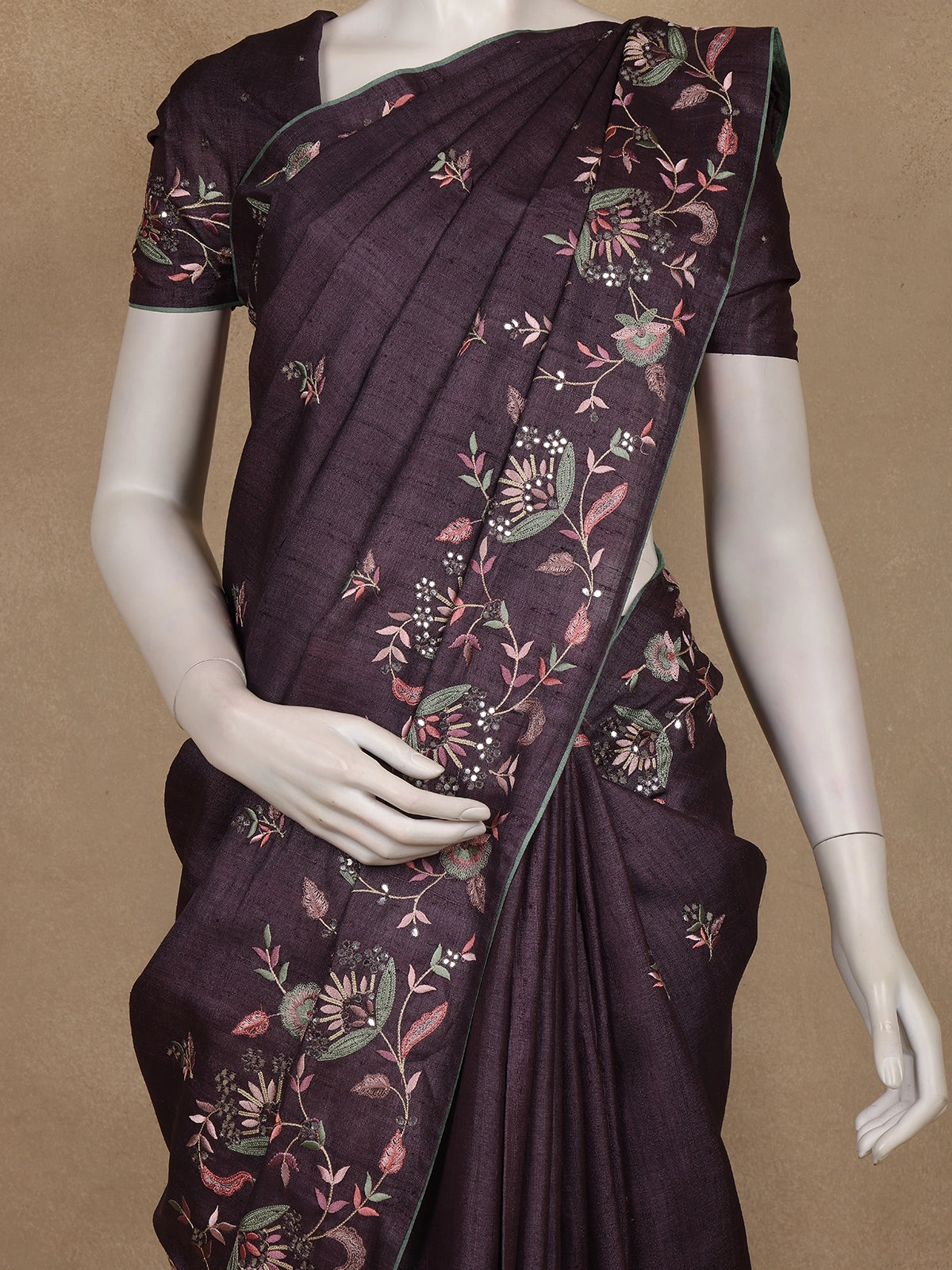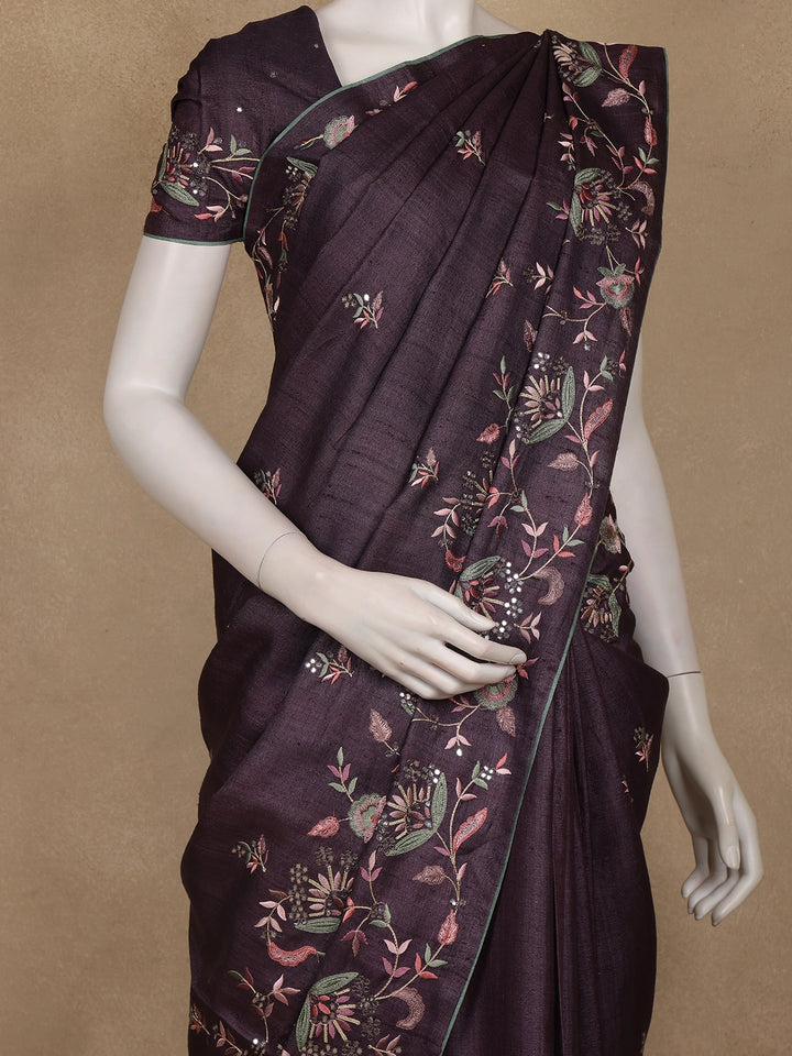 Deep Plum Floral Embroidered Tussar Silk Saree
