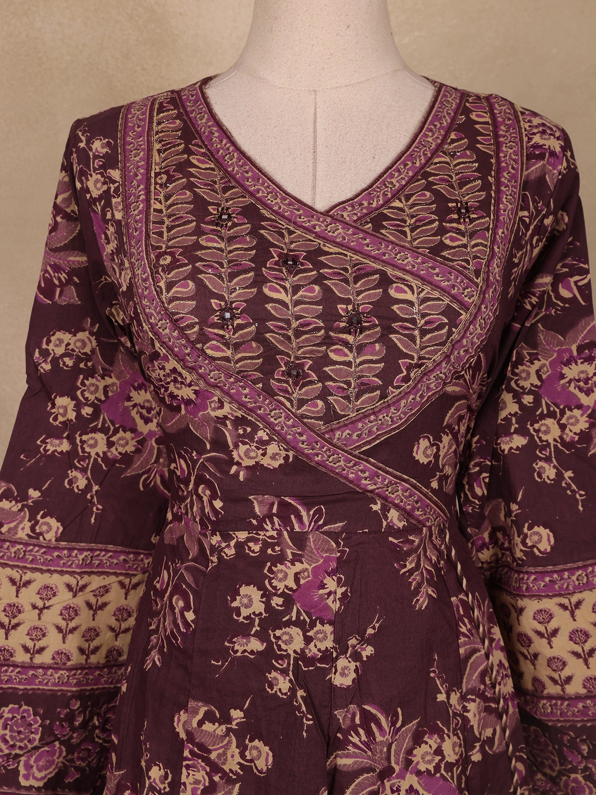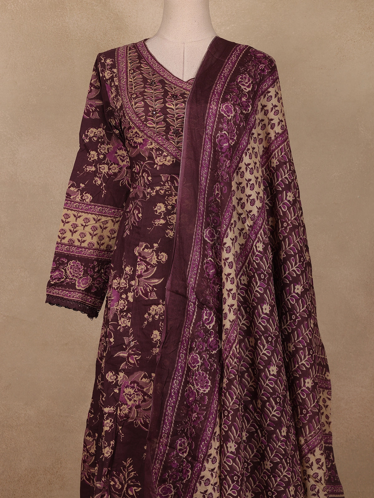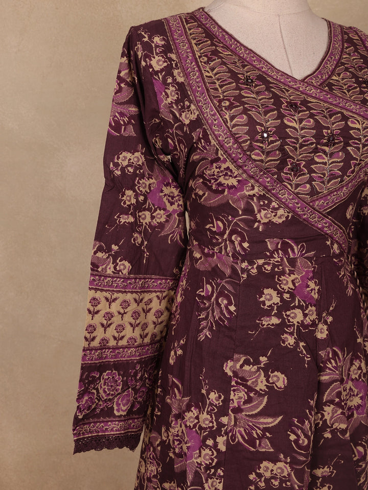 Step into effortless elegance with this deep plum cotton salwar suit adorned with exquisite floral and vine prints in soft beige and lilac hues. The kurta features a beautifully crafted overlapping V-neckline highlighted with fine thread embroidery and contrast piping, lending a refined and graceful appeal. The front yoke showcases delicate sequin embellishments that add just the right touch of shimmer, while the three-quarter sleeves with embroidered cuffs enhance its traditional charm.