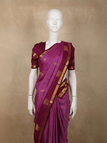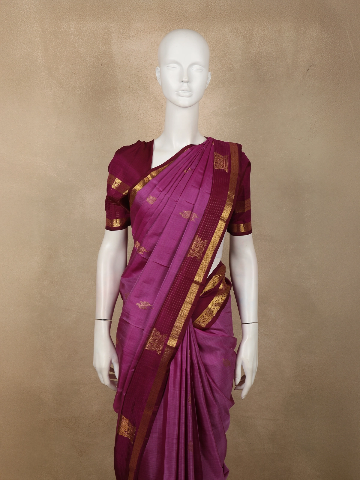 Elegant and deeply traditional, this deep plum purple pure Kanchipuram silk saree reflects the timeless beauty of South Indian handloom artistry. The luxurious plum purple body carries a rich depth of color that exudes sophistication, making it a graceful choice for festive and traditional occasions.