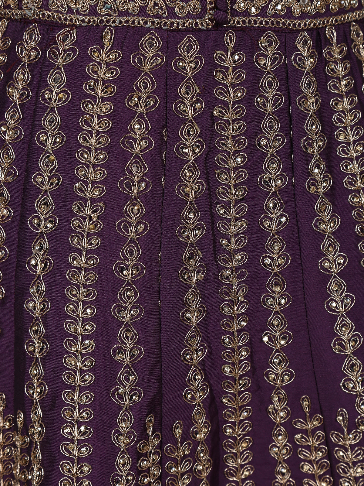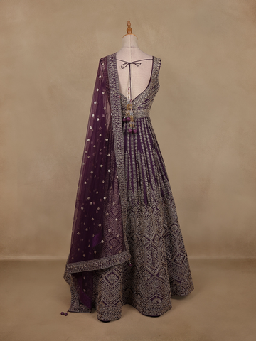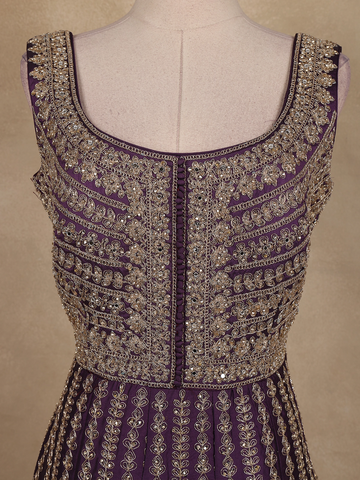The gown features exquisite floral embroidery intricately woven with fine thread and sequins, creating a mesmerizing play of shimmer against the deep plum base. The round neckline and sleeveless silhouette lend a contemporary edge, while the matching embroidered dupatta adds a layer of elegance and balance to the ensemble.
