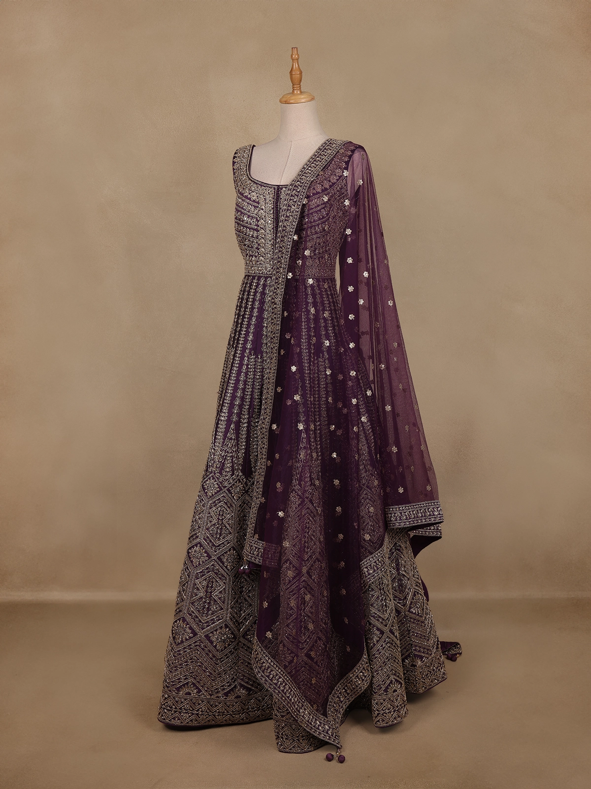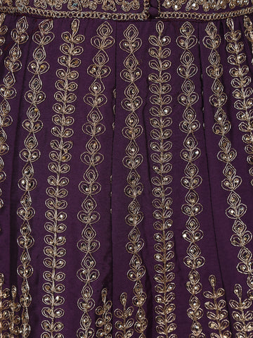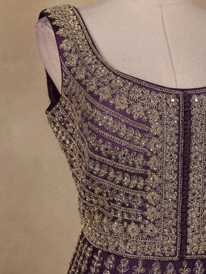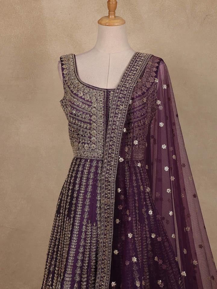 Deep Plum Purple Floral Embroidered Design Net Gown