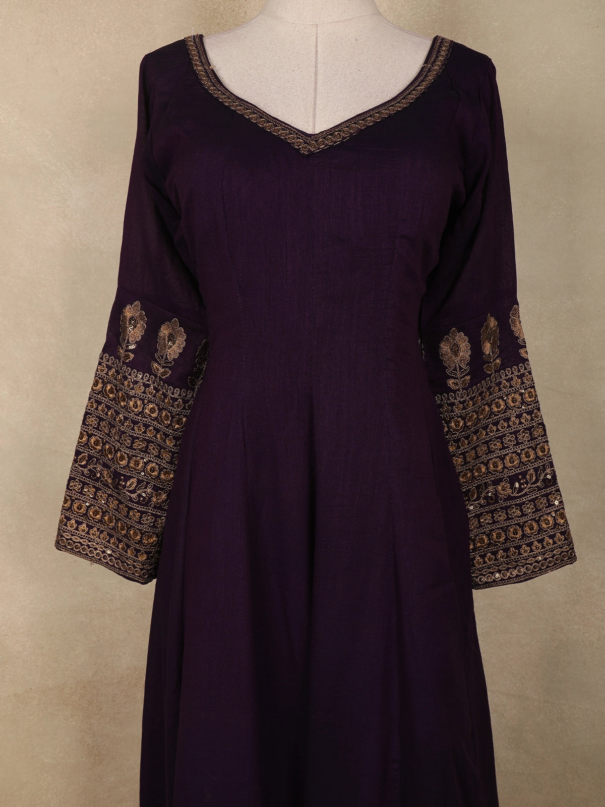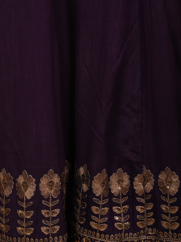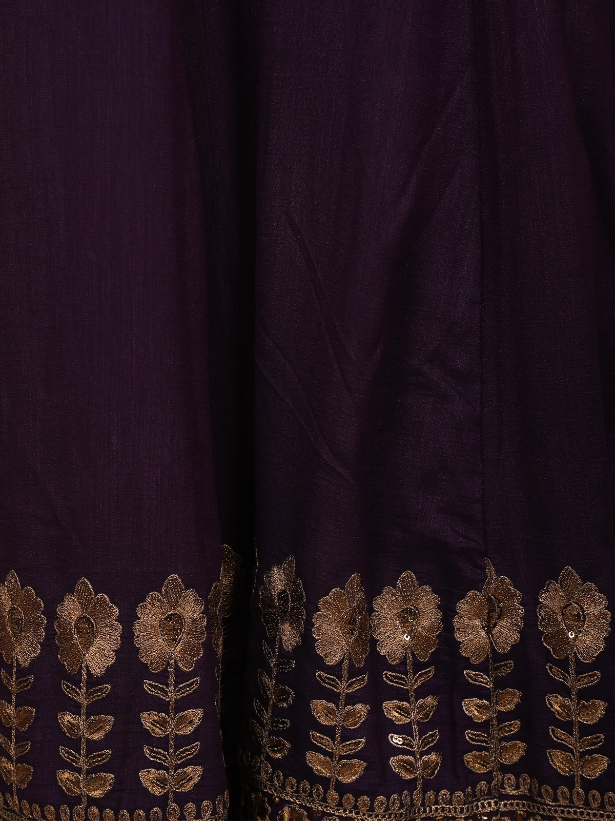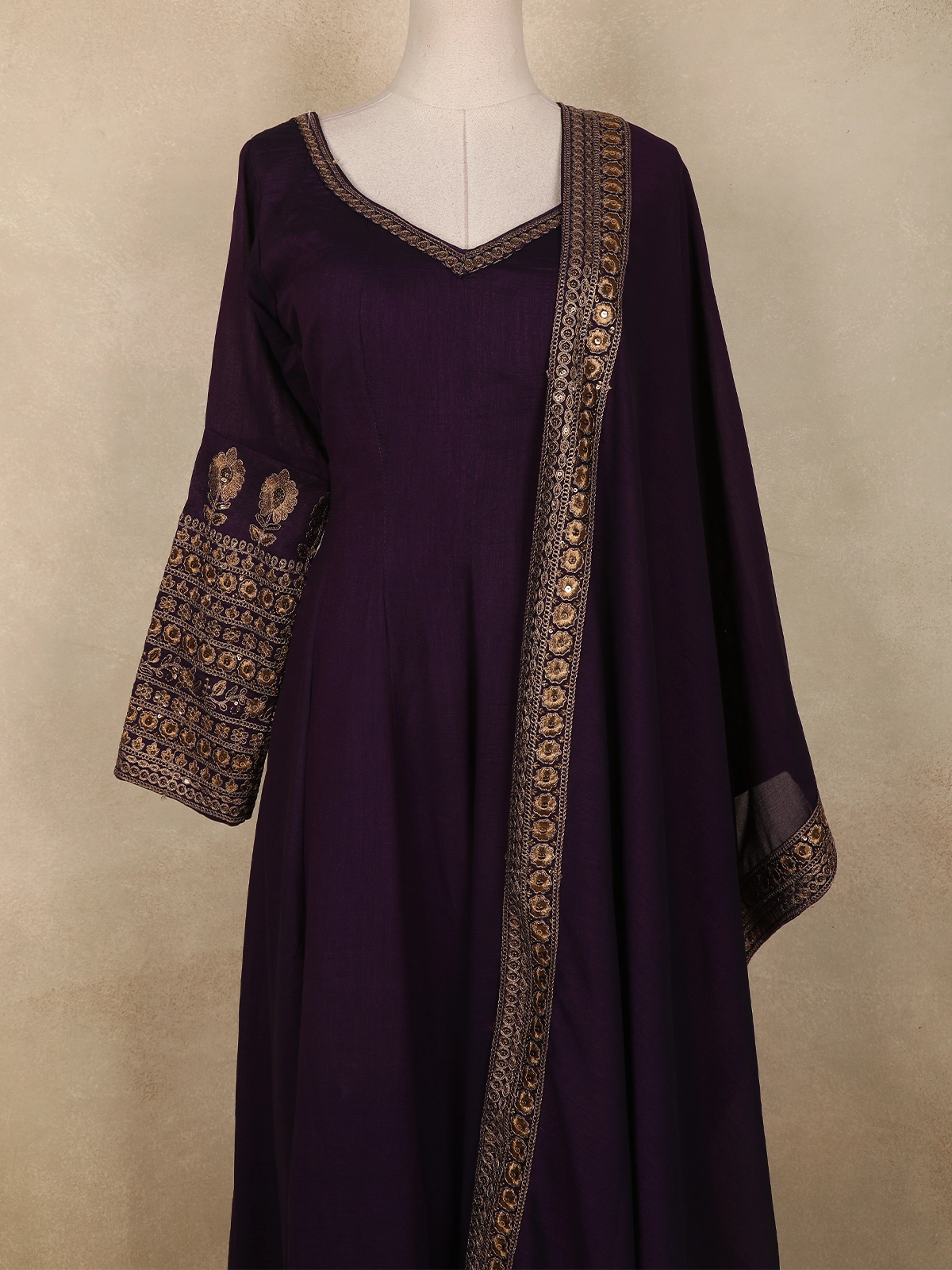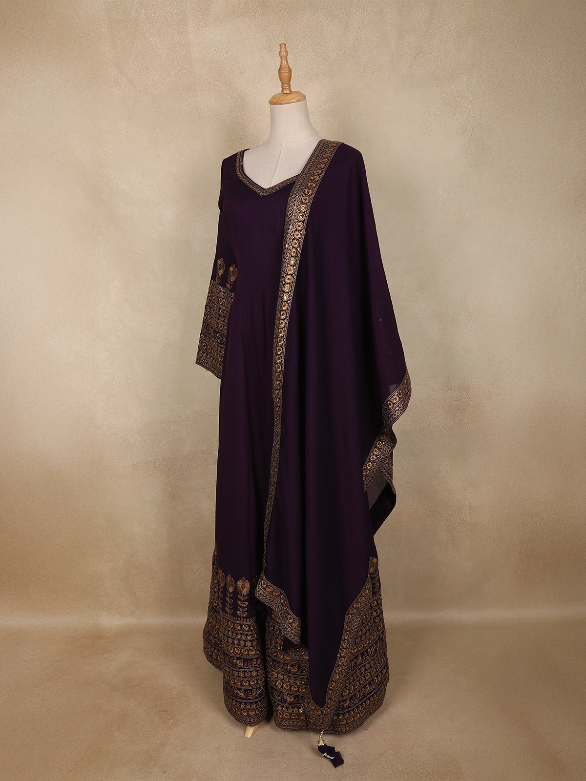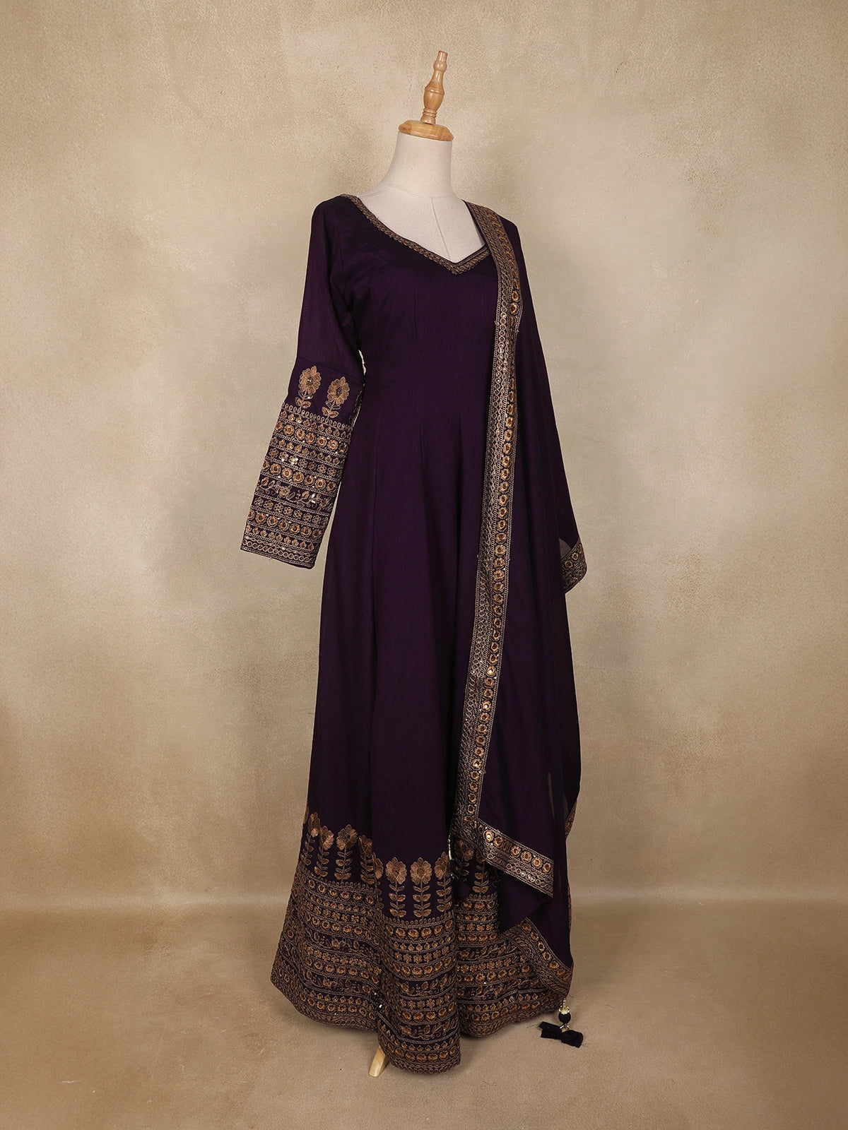 Deep Plum Purple Floral Embroidered Design Raw Silk Gown with Dupatta