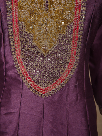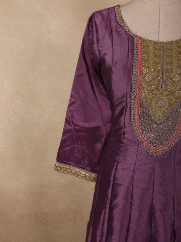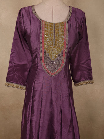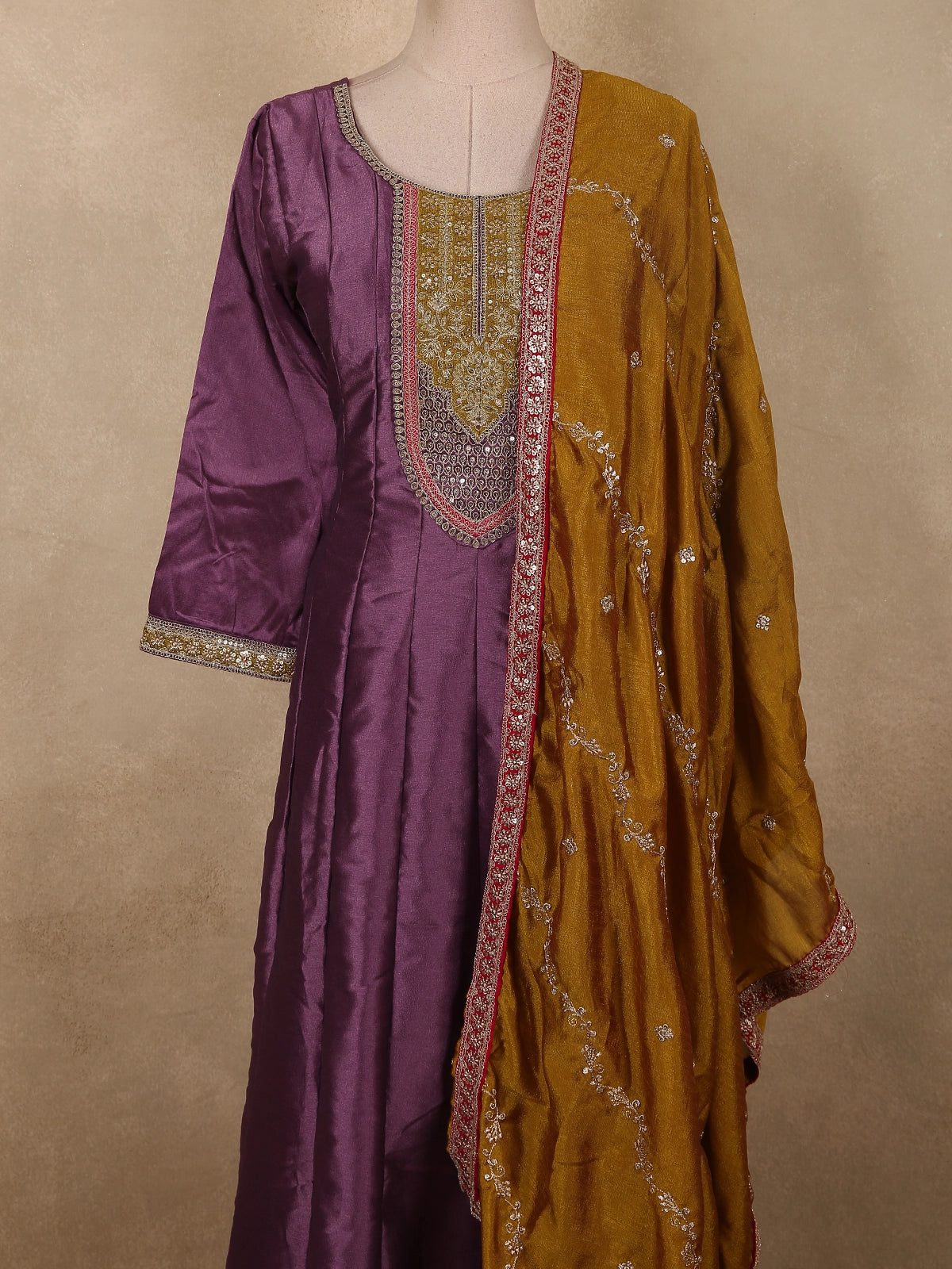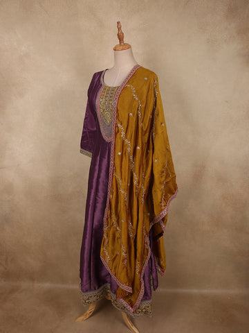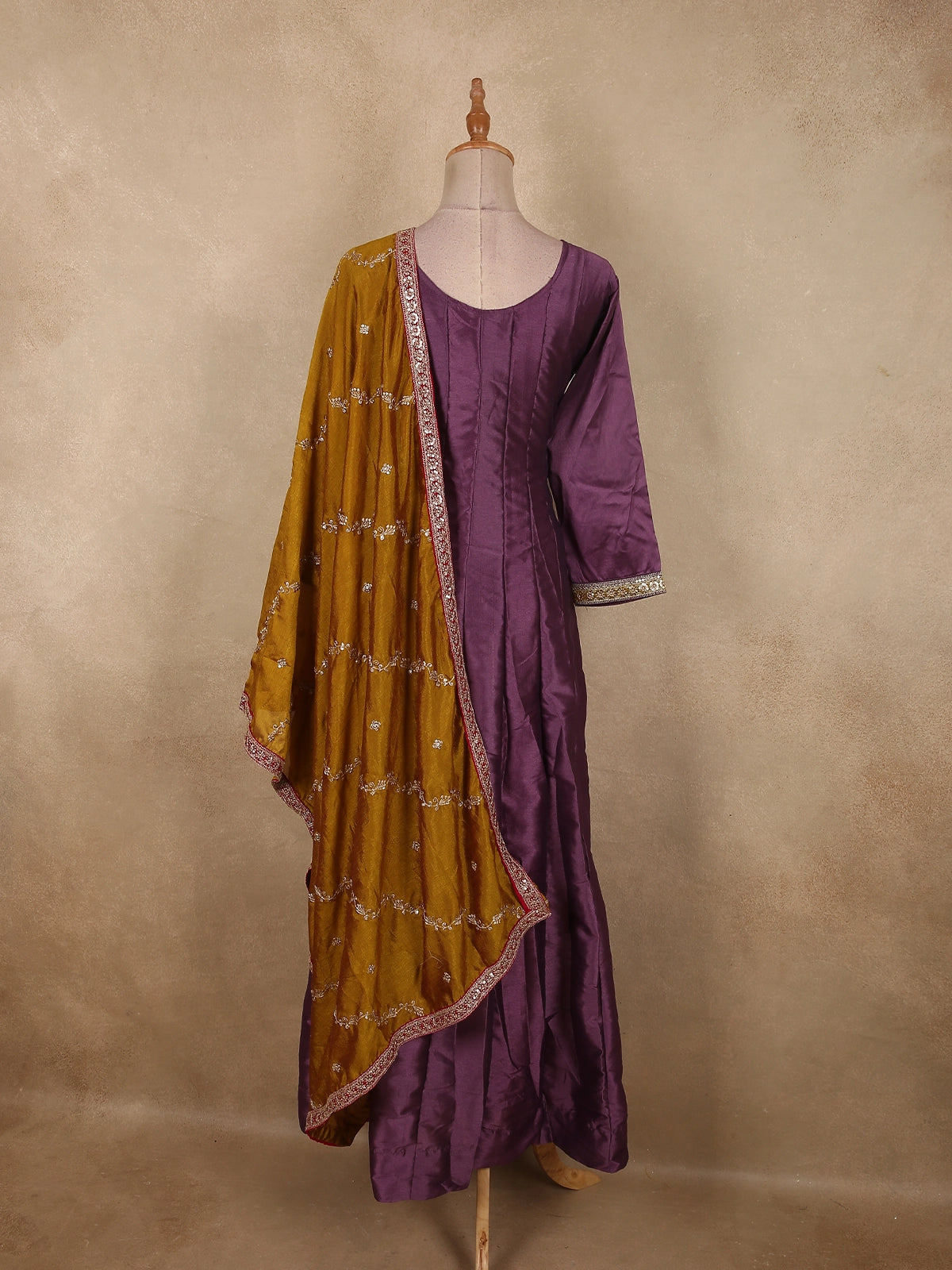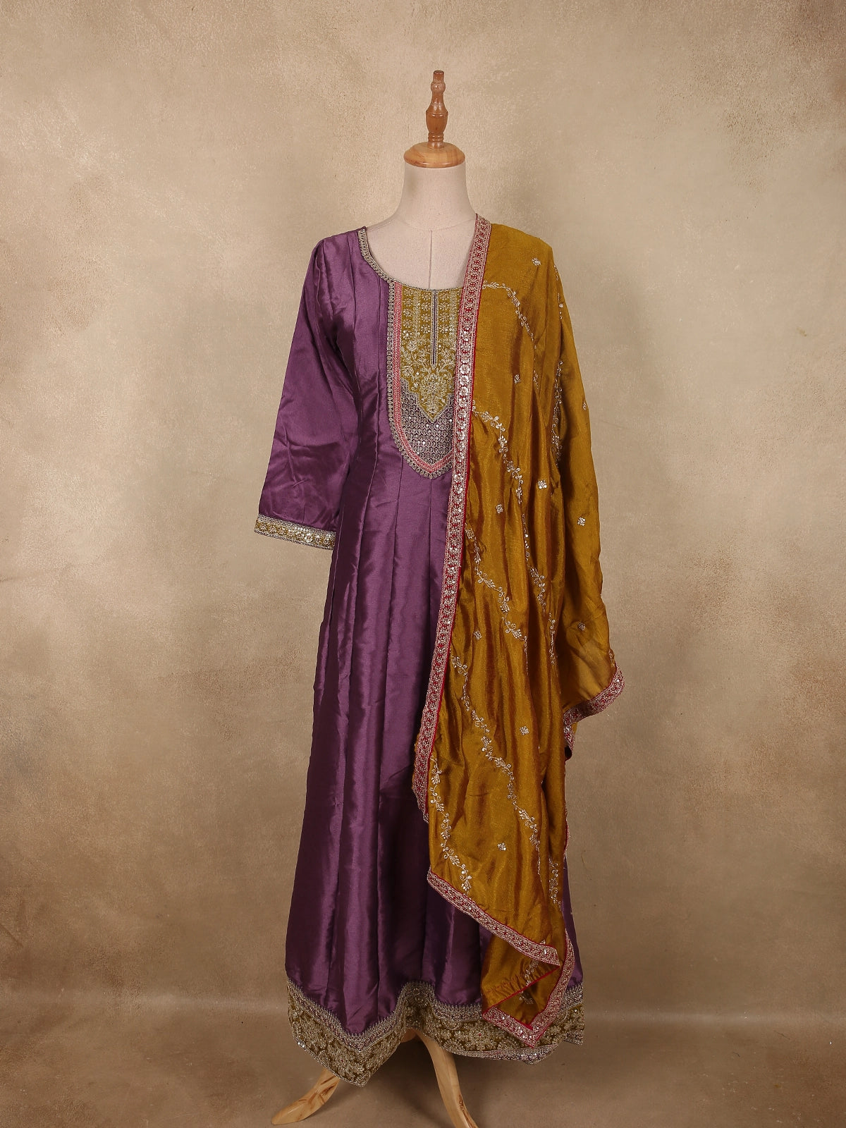 Deep Plum Purple Sequins Zari Embroidered Design Semi Silk Anarkali Gown with Contrast Dupatta