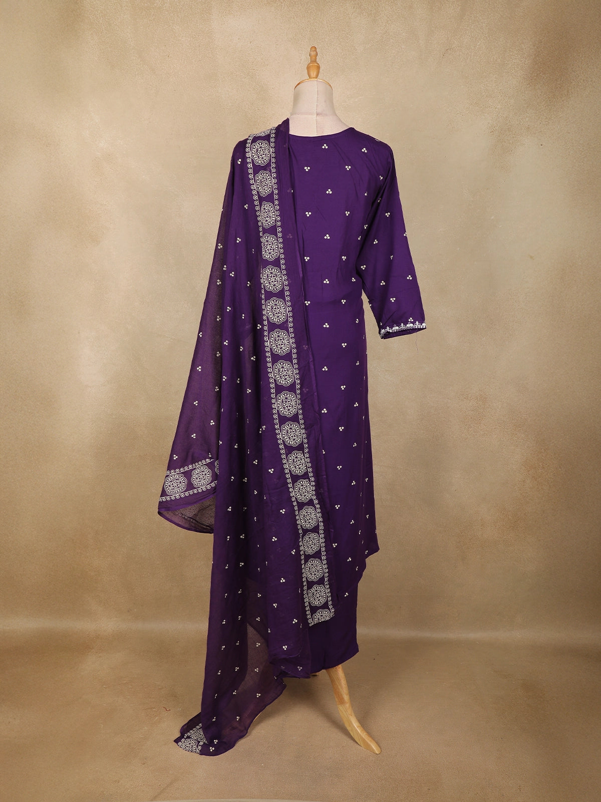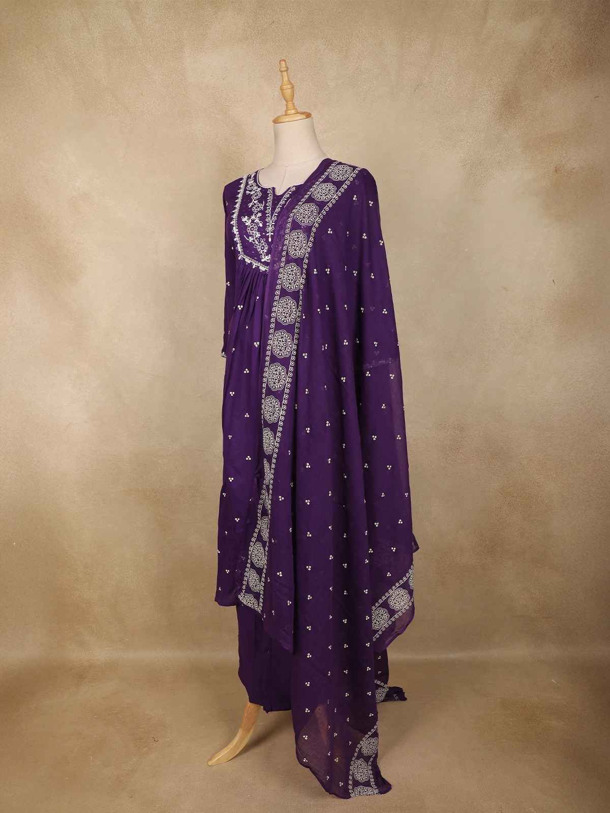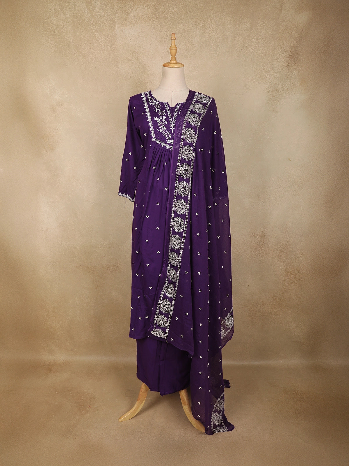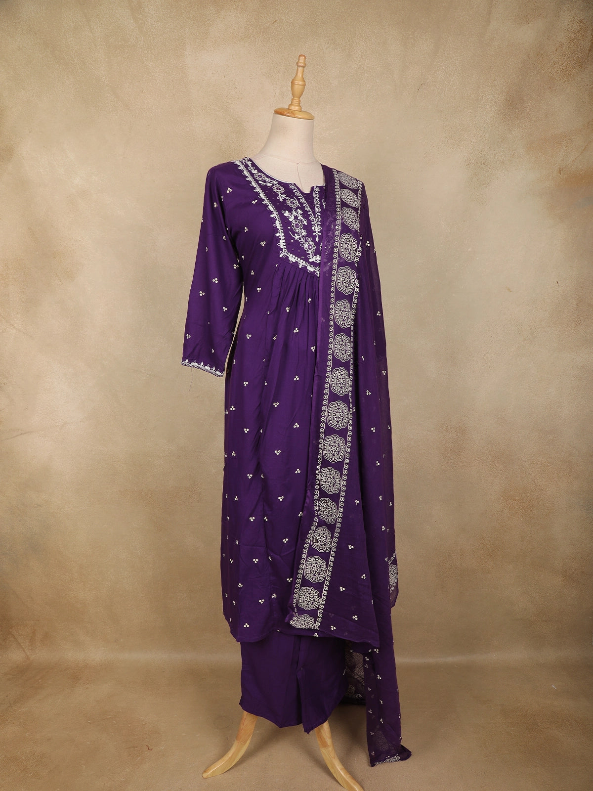 Embrace timeless elegance with this Deep Purple Cotton Anarkali Salwar Suit, beautifully crafted to blend comfort with refined ethnic charm. The kurta features a graceful Anarkali silhouette, enhanced with intricate white floral thread embroidery adorning the yoke and neckline, lending a delicate contrast against the rich purple base. Subtle embroidered floral motifs are scattered across the body, adding depth and visual appeal without overpowering the design.