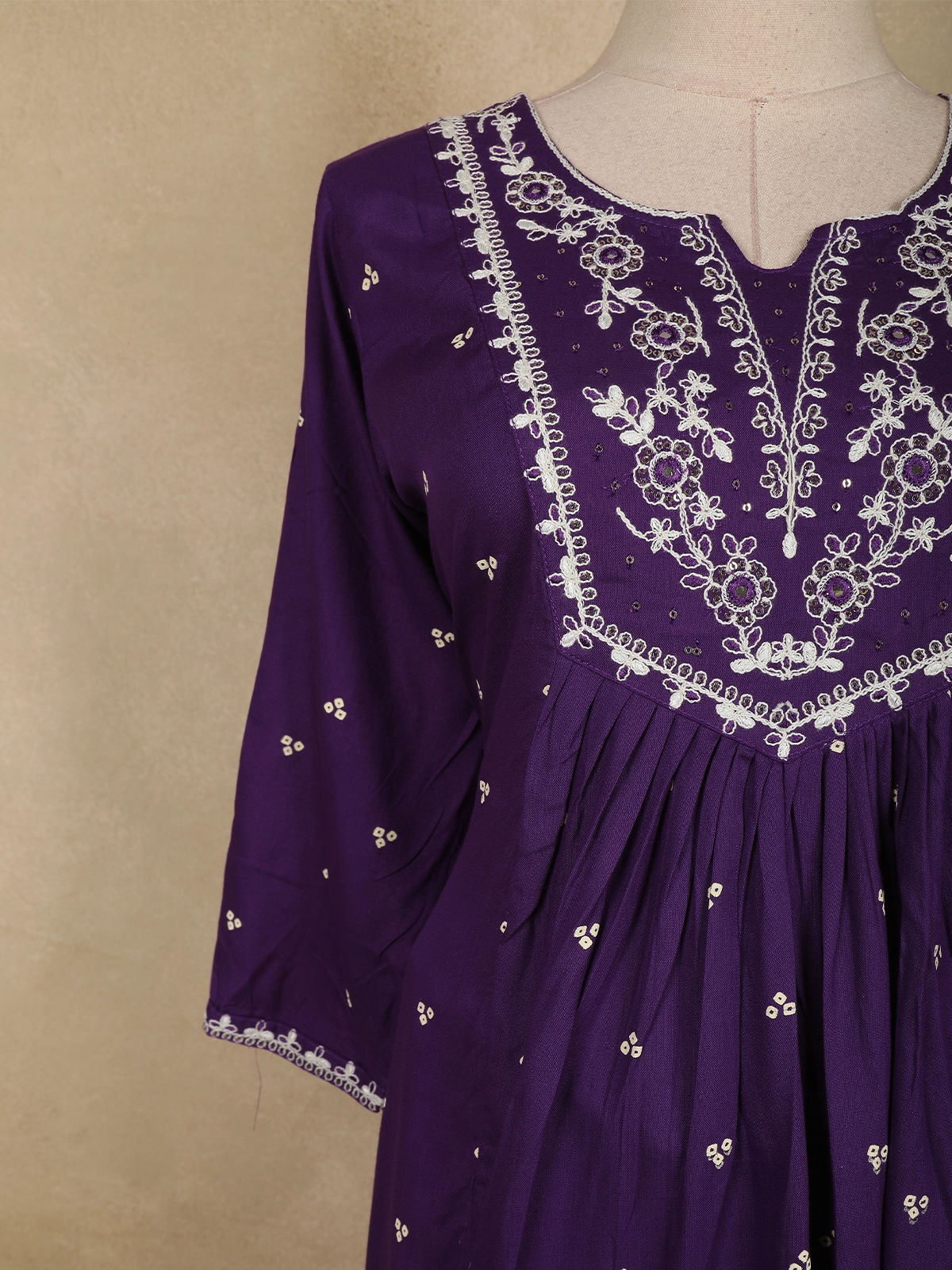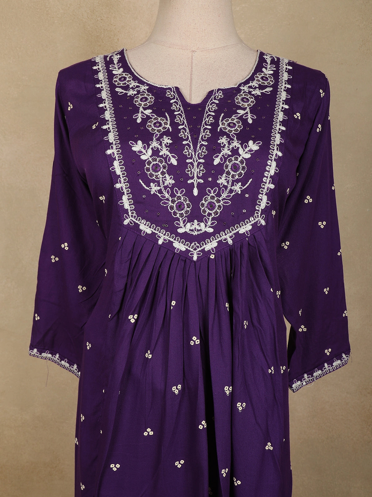 The softly flared Anarkali cut creates an elegant flow, while the three-quarter sleeves are finished with fine embroidered borders, perfectly complementing the neckline detailing. Made from breathable cotton fabric, this ensemble ensures all-day comfort, making it ideal for festive gatherings, casual celebrations, or elegant daytime occasions.