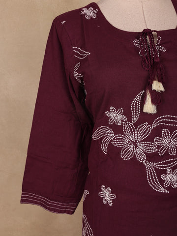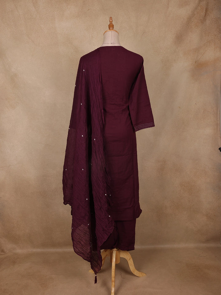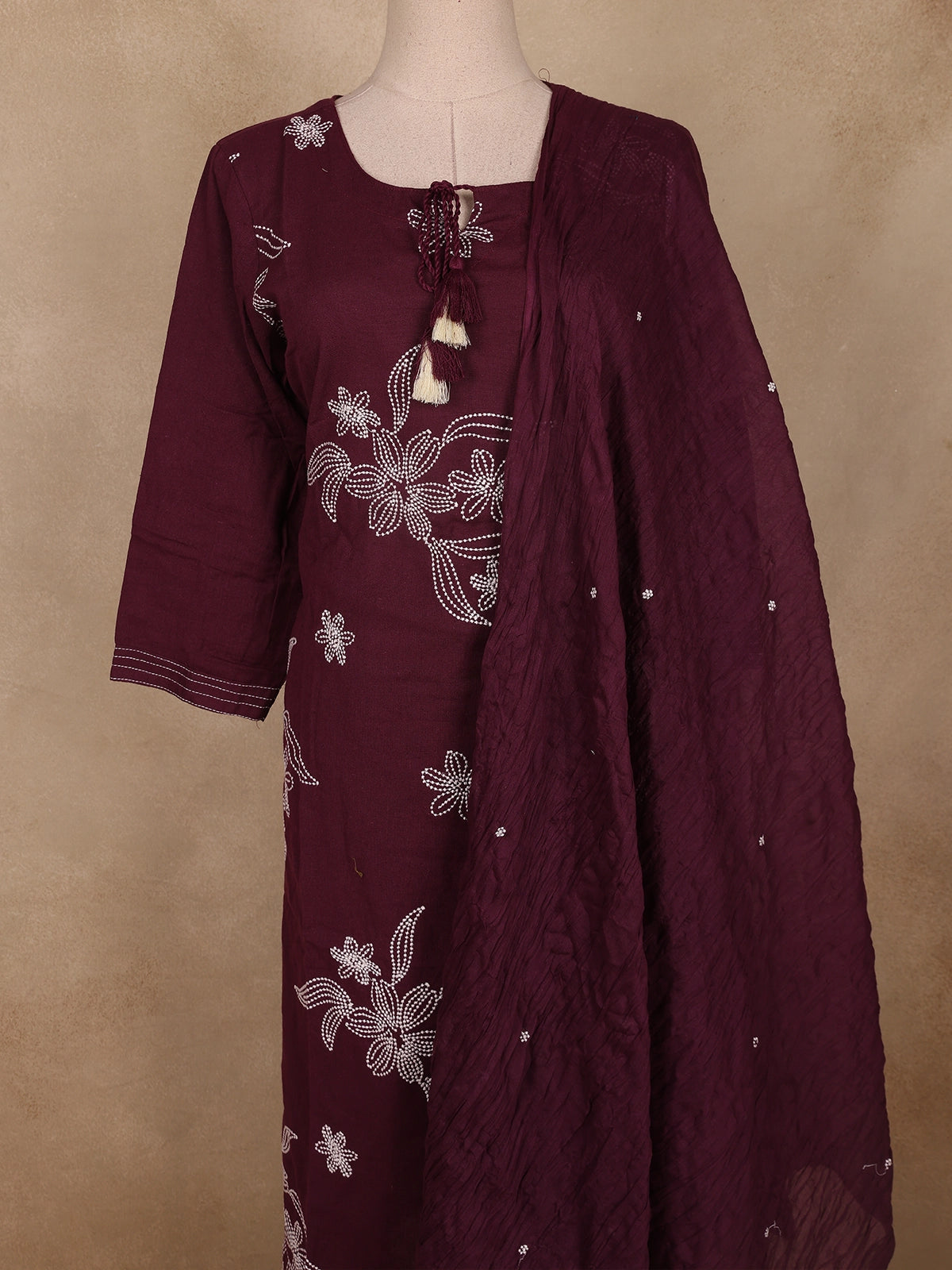 The kurta features delicate floral thread embroidery in contrast white tones, lending a handcrafted charm to the deep purple base. A round neckline with tasseled tie-up detail adds a hint of playful elegance, while the 3/4 sleeves with minimal thread accents balance the design beautifully. The set is completed with matching cotton bottoms and a crinkled dupatta, adorned with light sequin embellishments for a graceful festive finish.