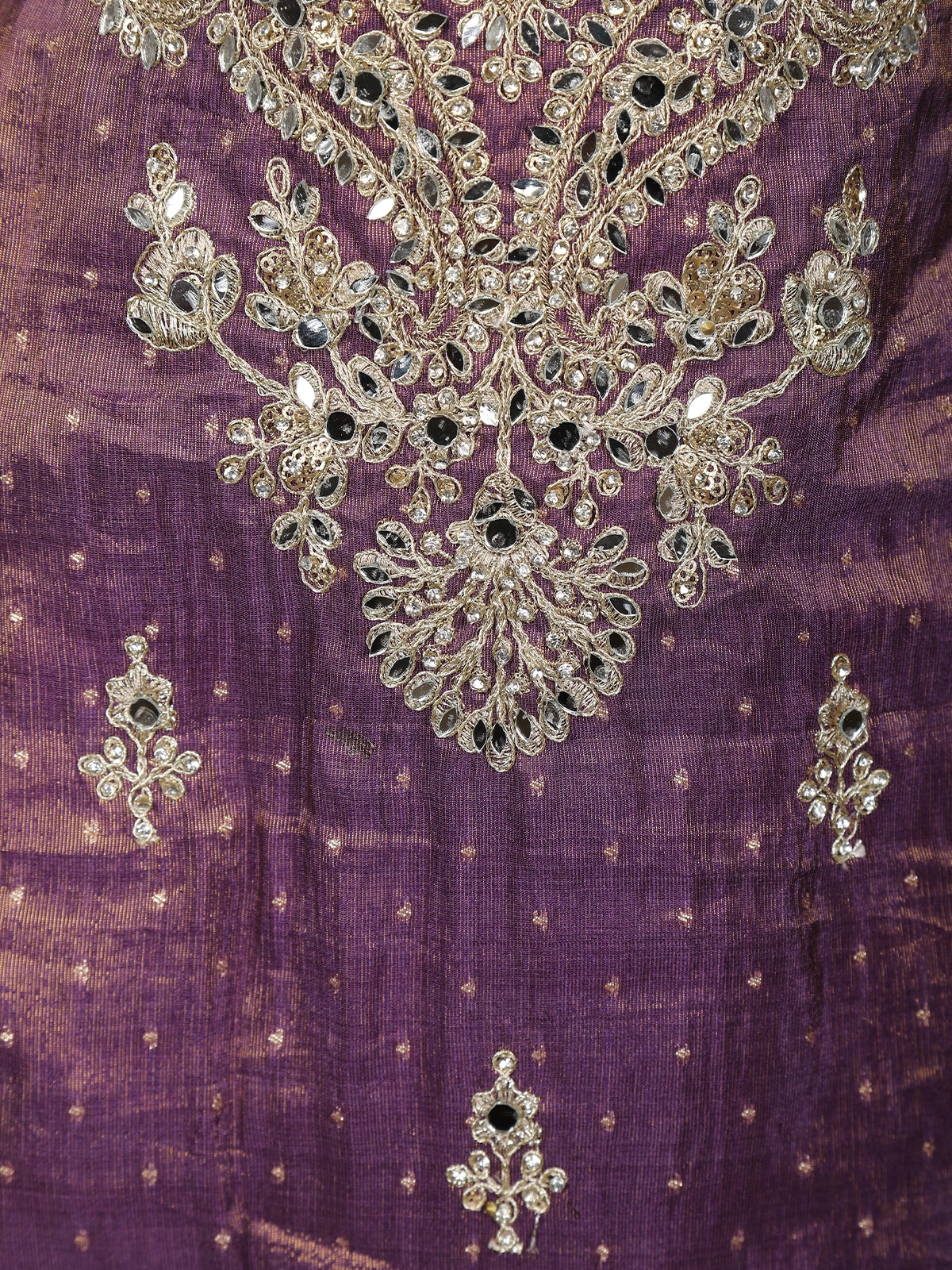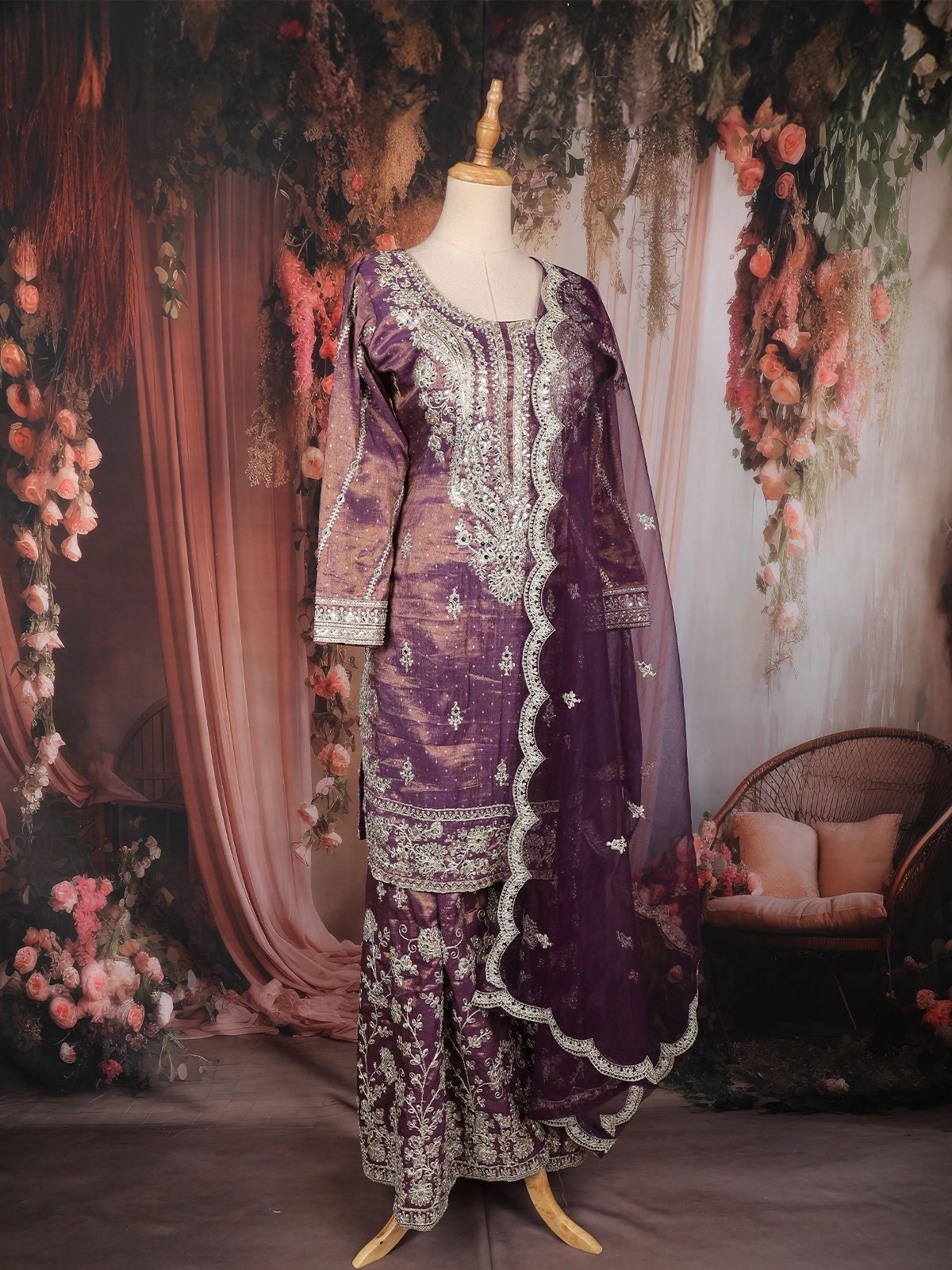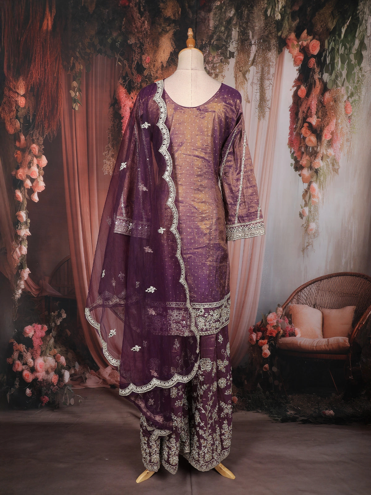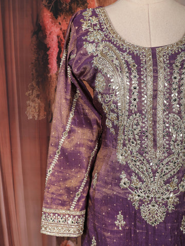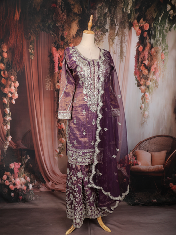 Deep Purple Floral Sequins and Beads Embroidered Design Tissue Palazzo Suit