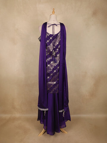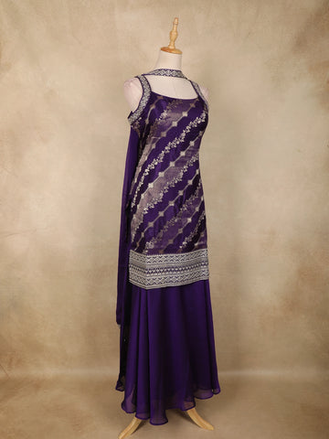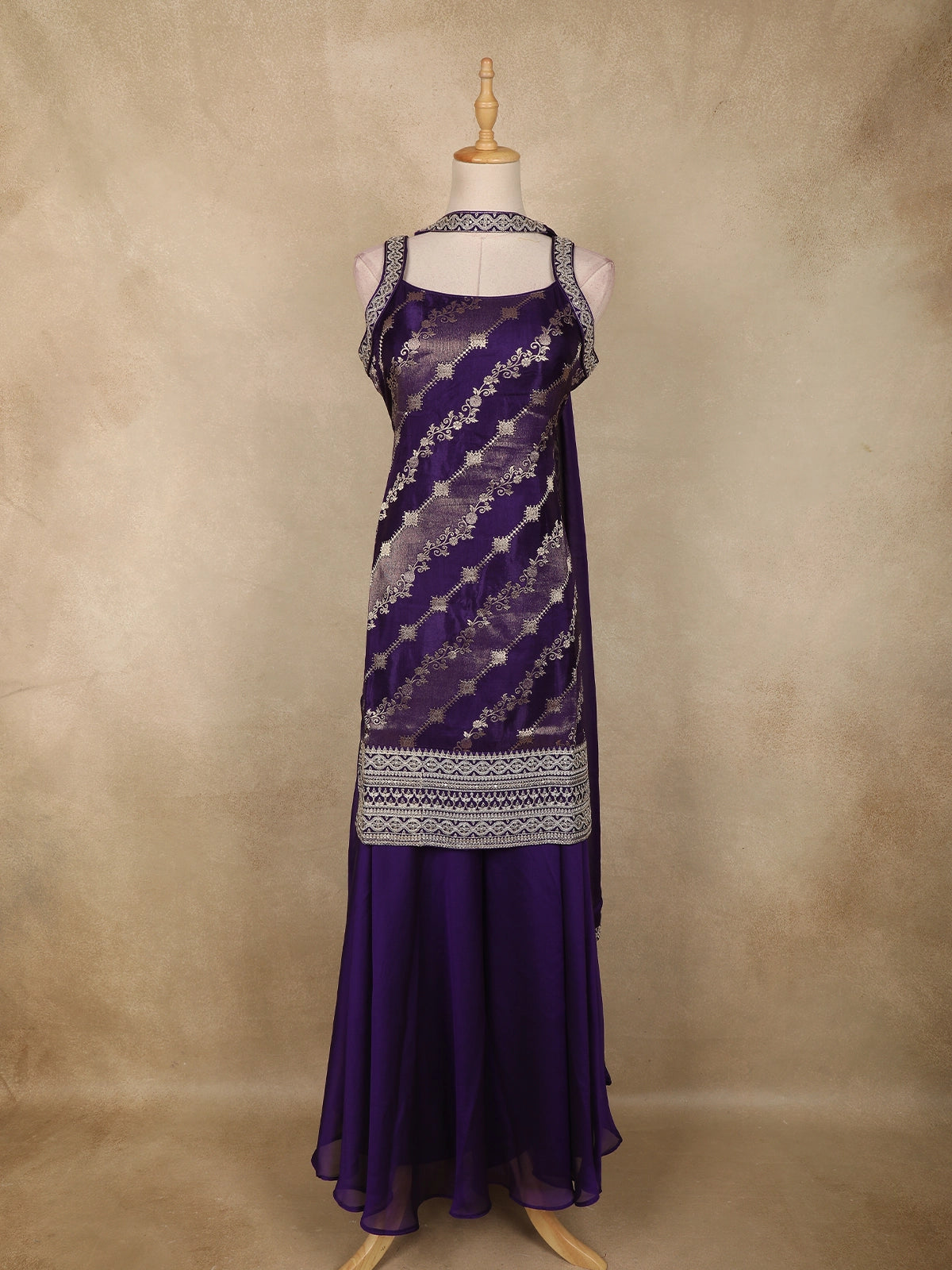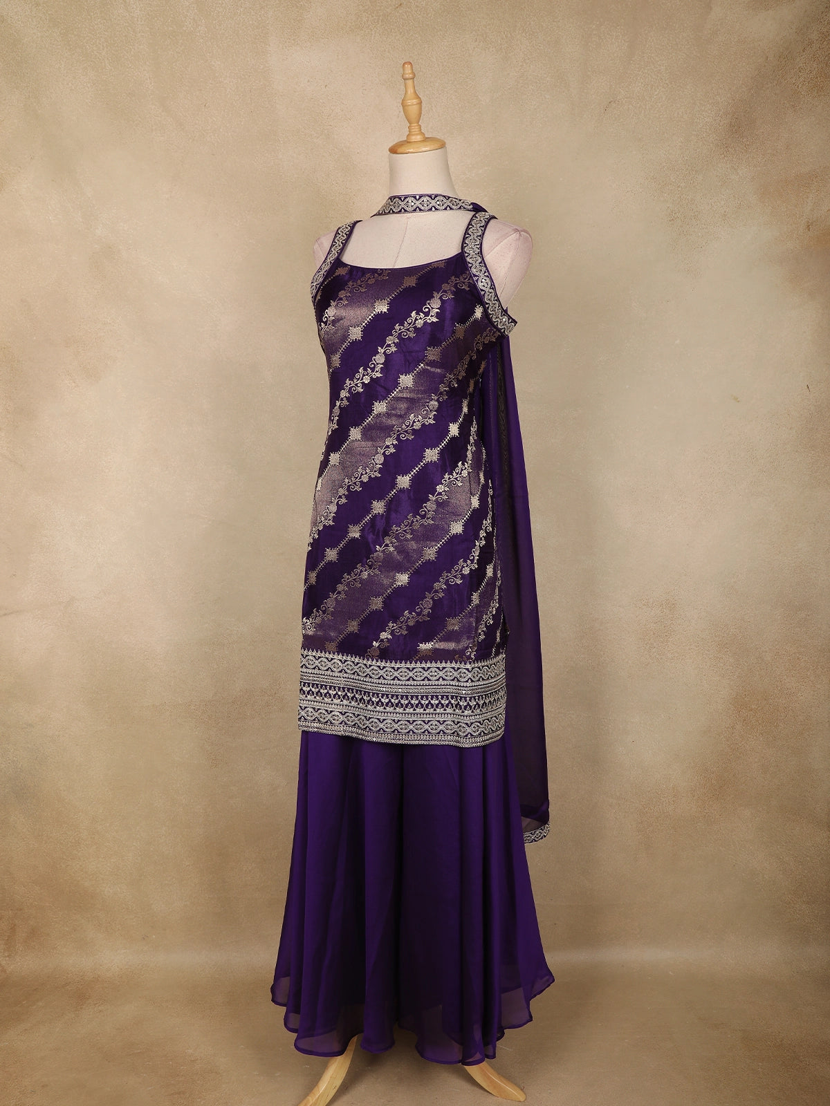 Paired with a flowy flared georgette bottom, this ensemble balances structure and movement perfectly, creating a flattering silhouette that feels light and comfortable while exuding sophistication. The deep purple hue enhances the richness of the zari work, making this outfit ideal for festive gatherings, evening celebrations, and special occasions.