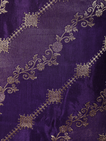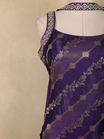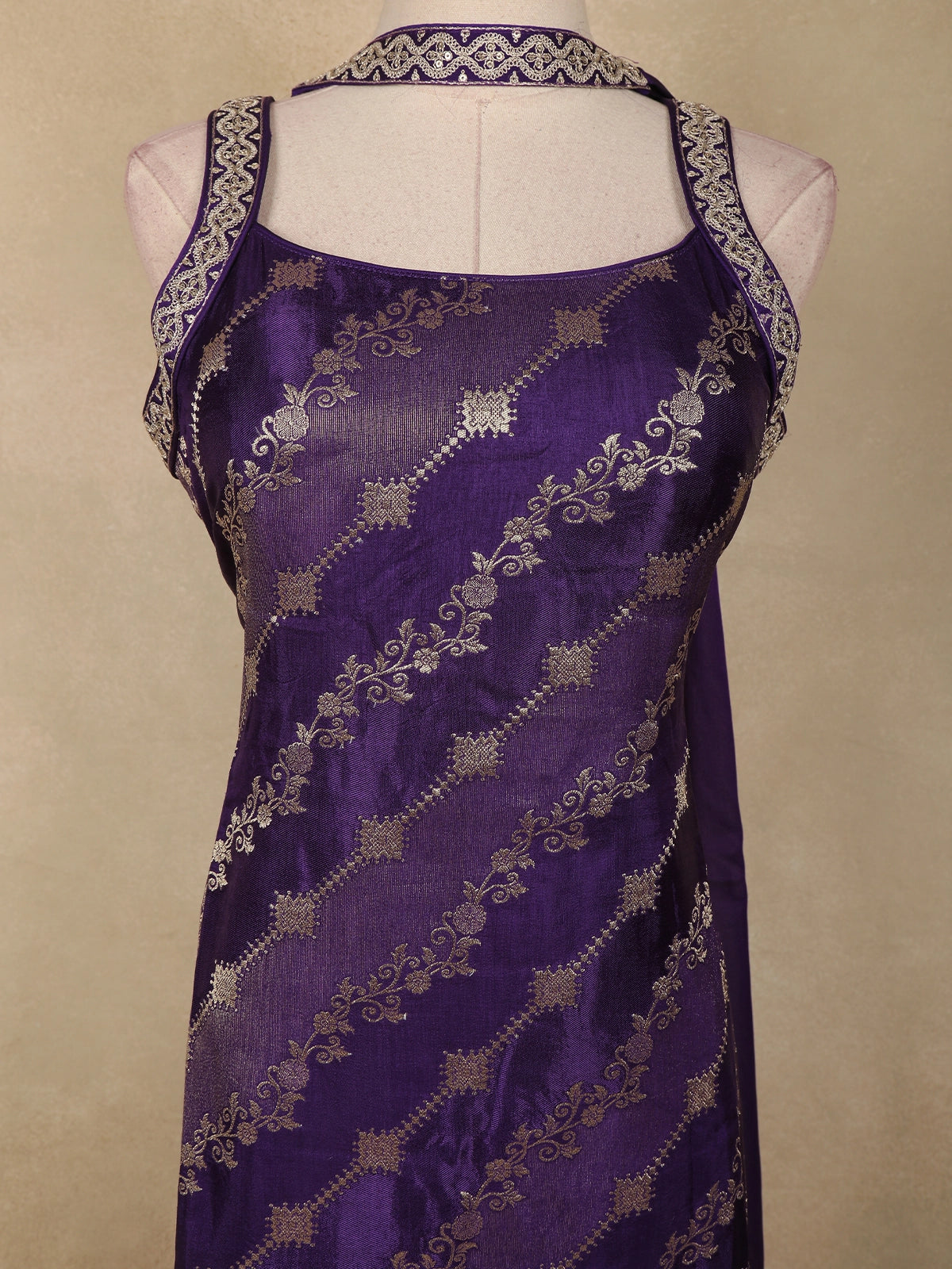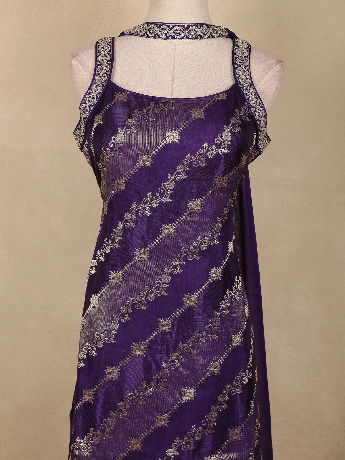 Step into effortless elegance with this Deep Purple Zari Woven Design Silk Salwar Suit, crafted to make a refined festive statement. The sleeveless kurti is designed in a rich silk fabric, highlighted with intricate diagonal zari woven motifs that lend a graceful shimmer and elevate its traditional appeal. A beautifully detailed zari border at the hemline and neckline adds definition and a polished finish.
