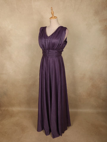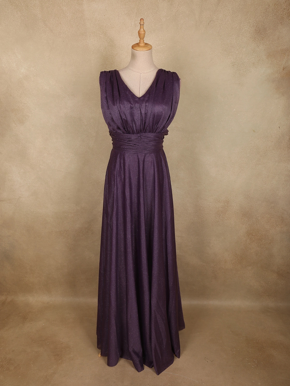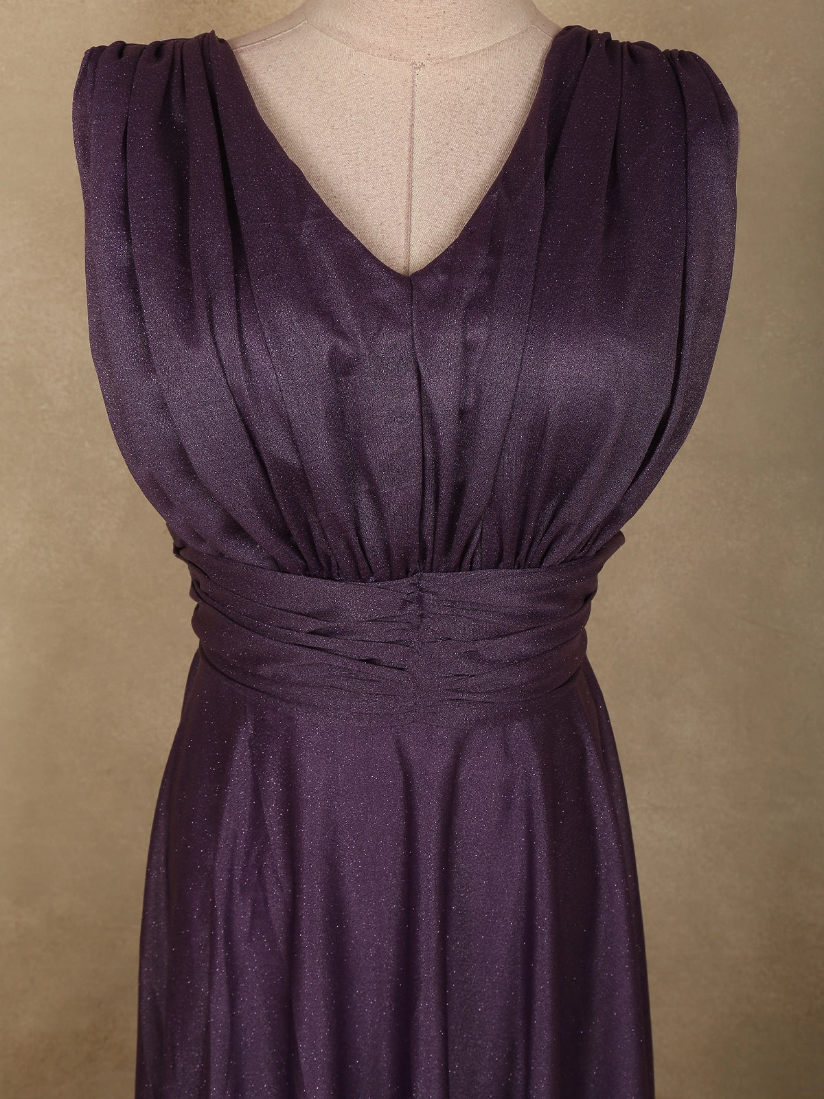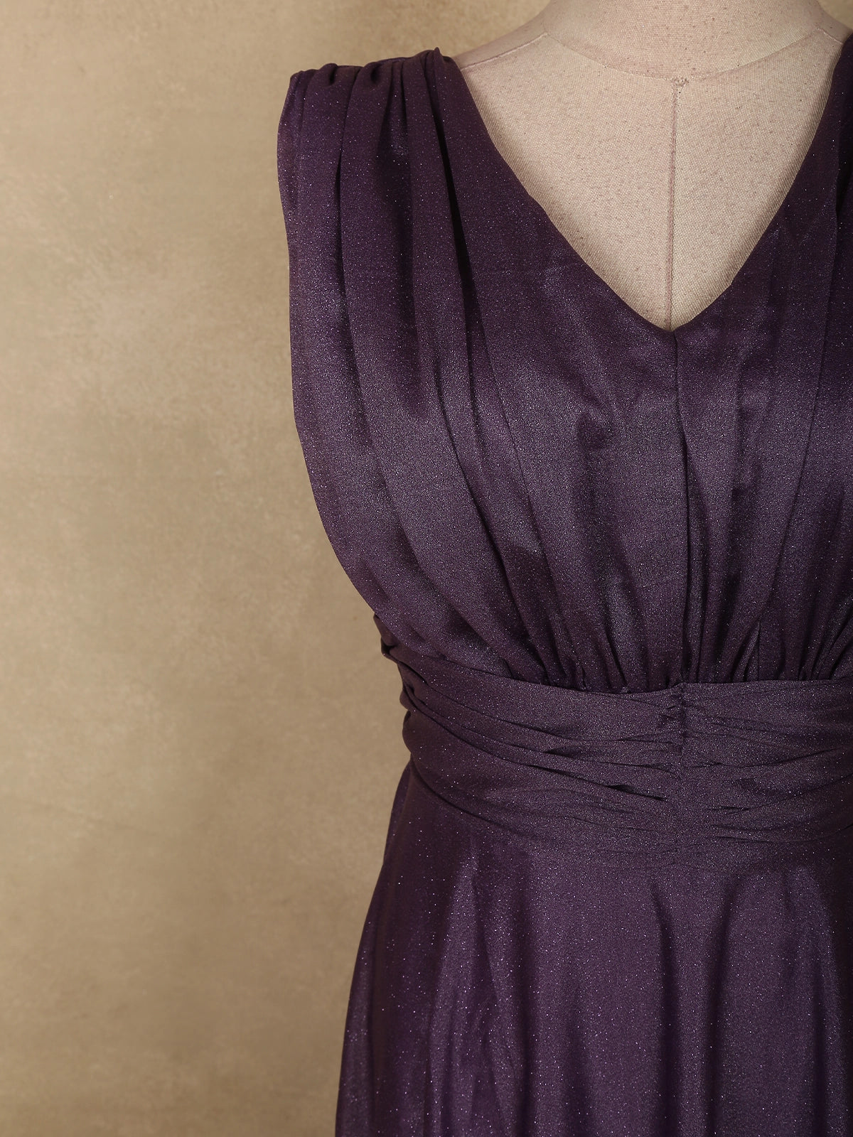 Crafted in a soft, flowy shimmer fabric, the gown features delicate micro-glitter detailing that gently catches the light, adding a refined sparkle without overpowering the look. The sleeveless silhouette is enhanced with a flattering V-neckline, giving it a modern yet classic appeal. Soft gathers along the bodice add texture and dimension, while the neatly pleated waistband accentuates the waistline, creating a beautifully structured and feminine shape.