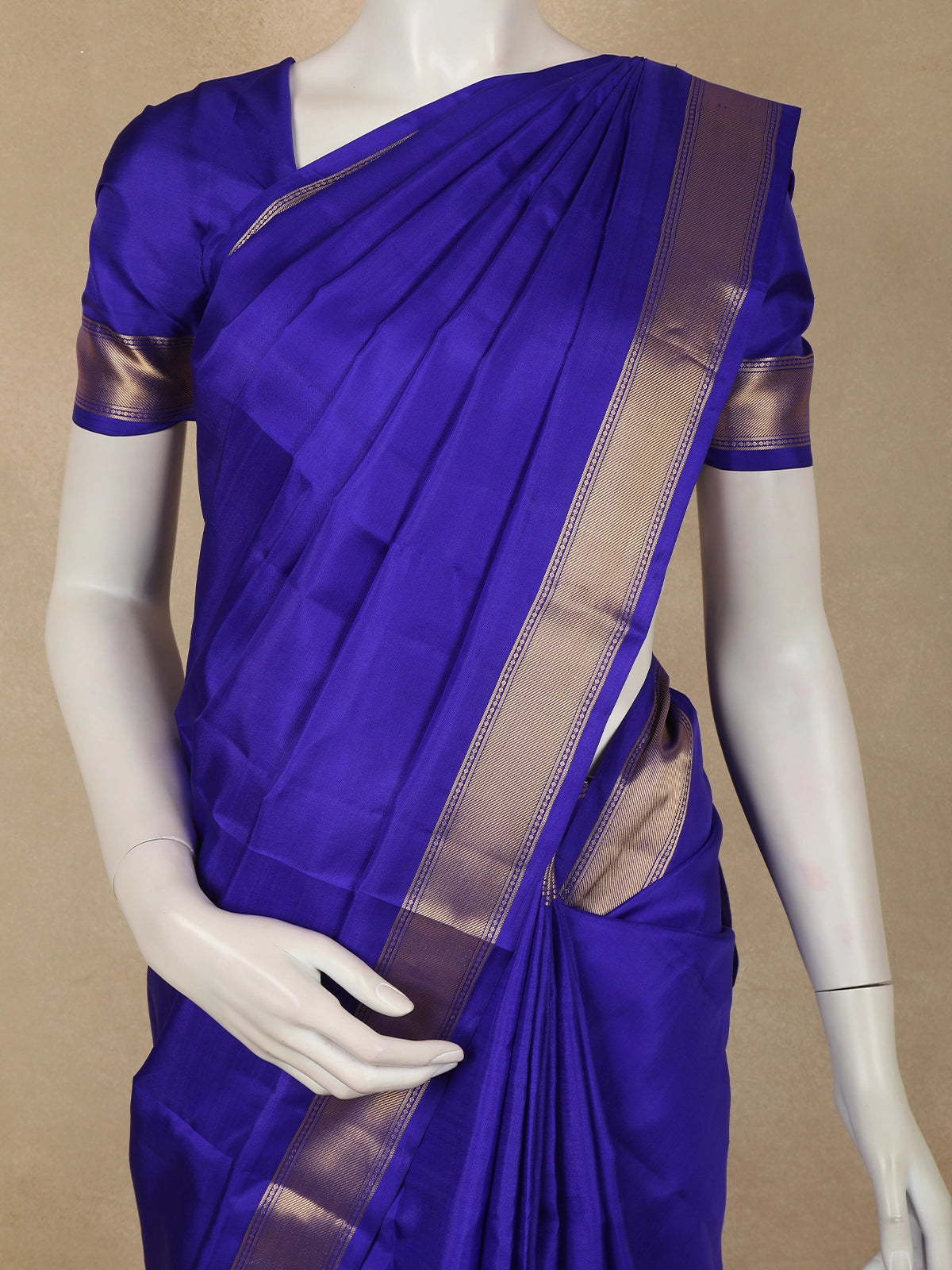 The saree is beautifully finished with a traditional gold zari border, intricately woven to add a regal contrast and highlight the grandeur of the silk. The solid body allows the richness of the fabric and the precision of the zari work to take center stage, making it a versatile choice for both grand and minimal styling.