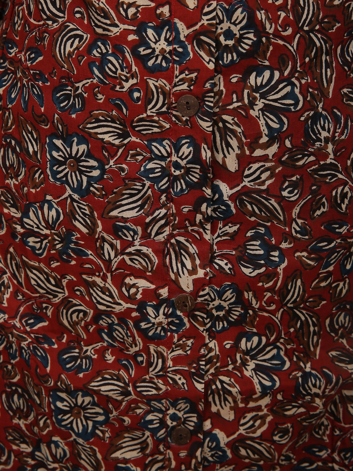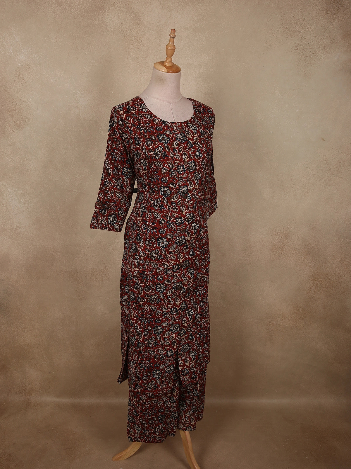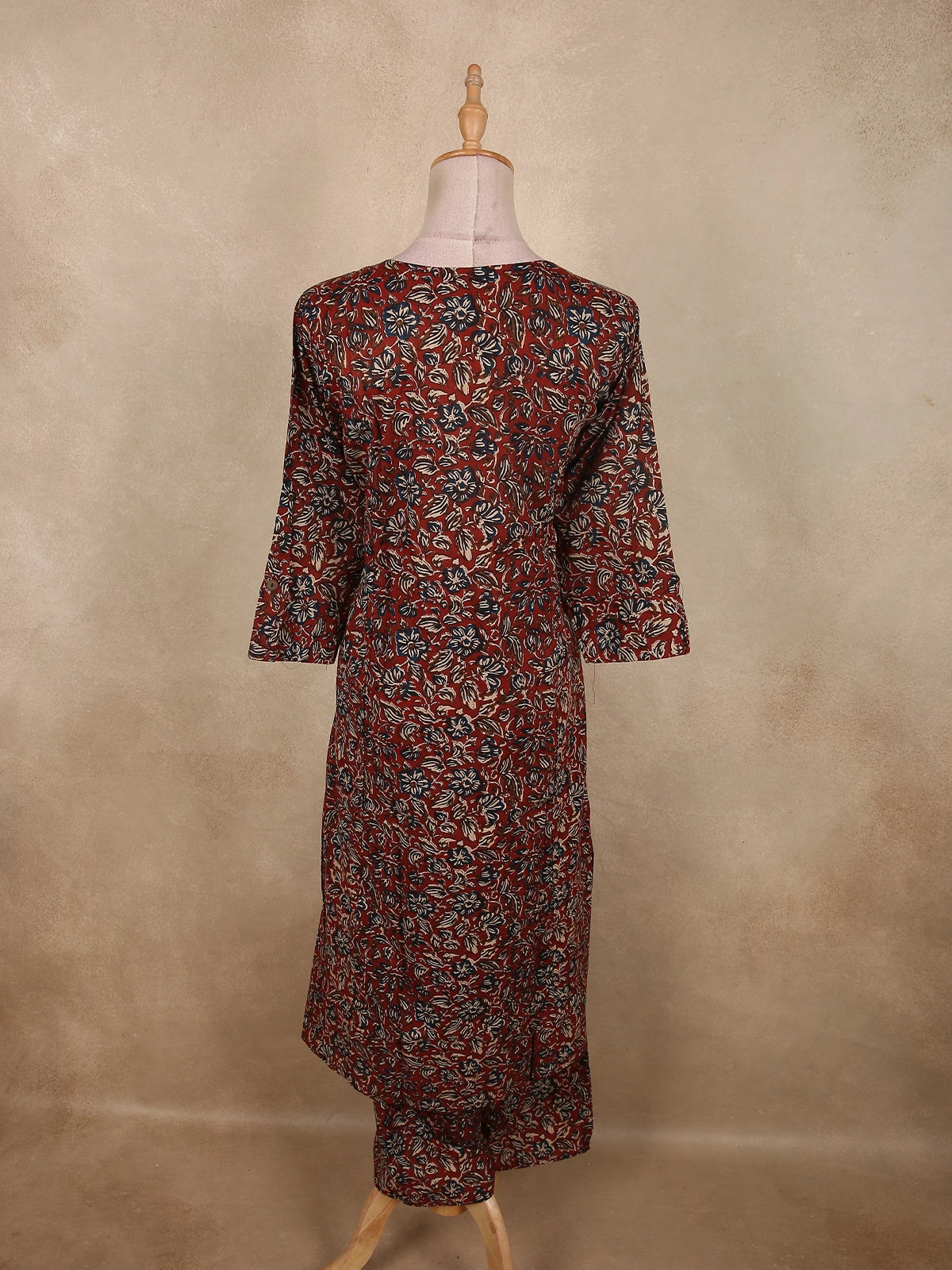 Elegant, earthy, and effortlessly stylish, this Deep Rust Maroon Cotton Palazzo Suit is a perfect blend of comfort and timeless ethnic charm. Designed in a rich rust-maroon tone, the outfit features intricate all-over floral prints in subtle navy and beige hues, creating a beautifully balanced and sophisticated look.