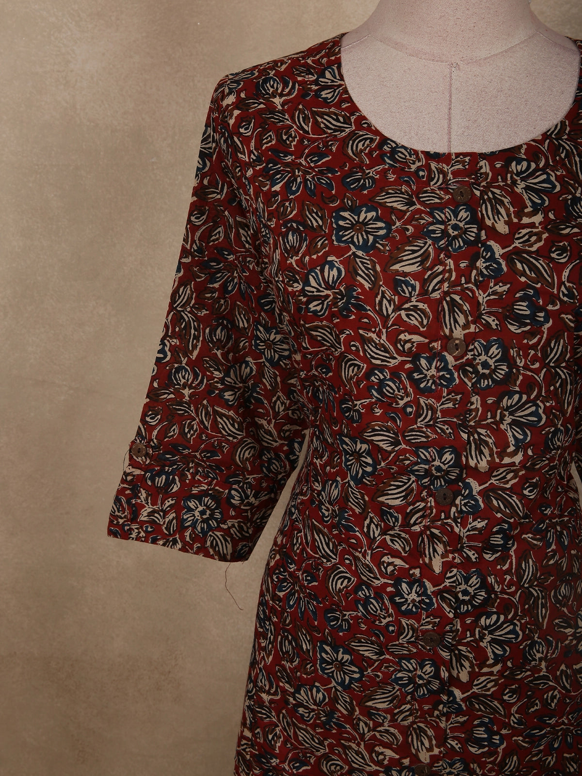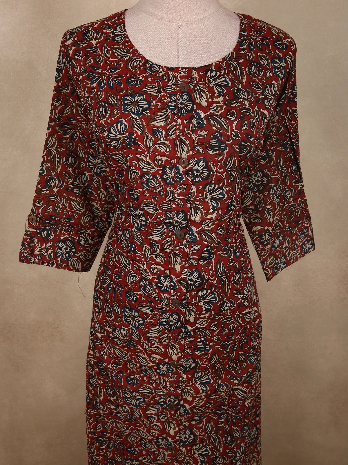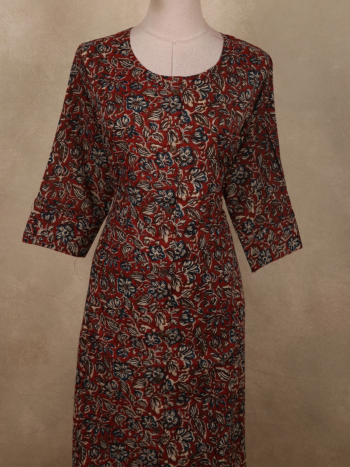 Elegant, earthy, and effortlessly stylish, this Deep Rust Maroon Cotton Palazzo Suit is a perfect blend of comfort and timeless ethnic charm. Designed in a rich rust-maroon tone, the outfit features intricate all-over floral prints in subtle navy and beige hues, creating a beautifully balanced and sophisticated look.