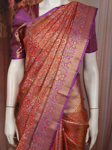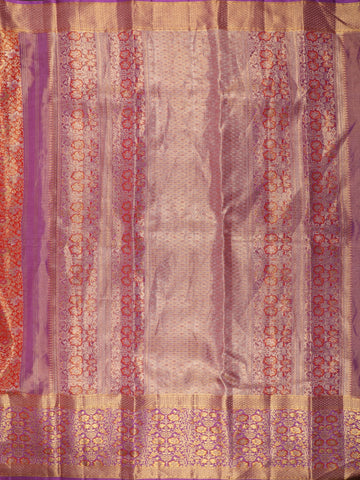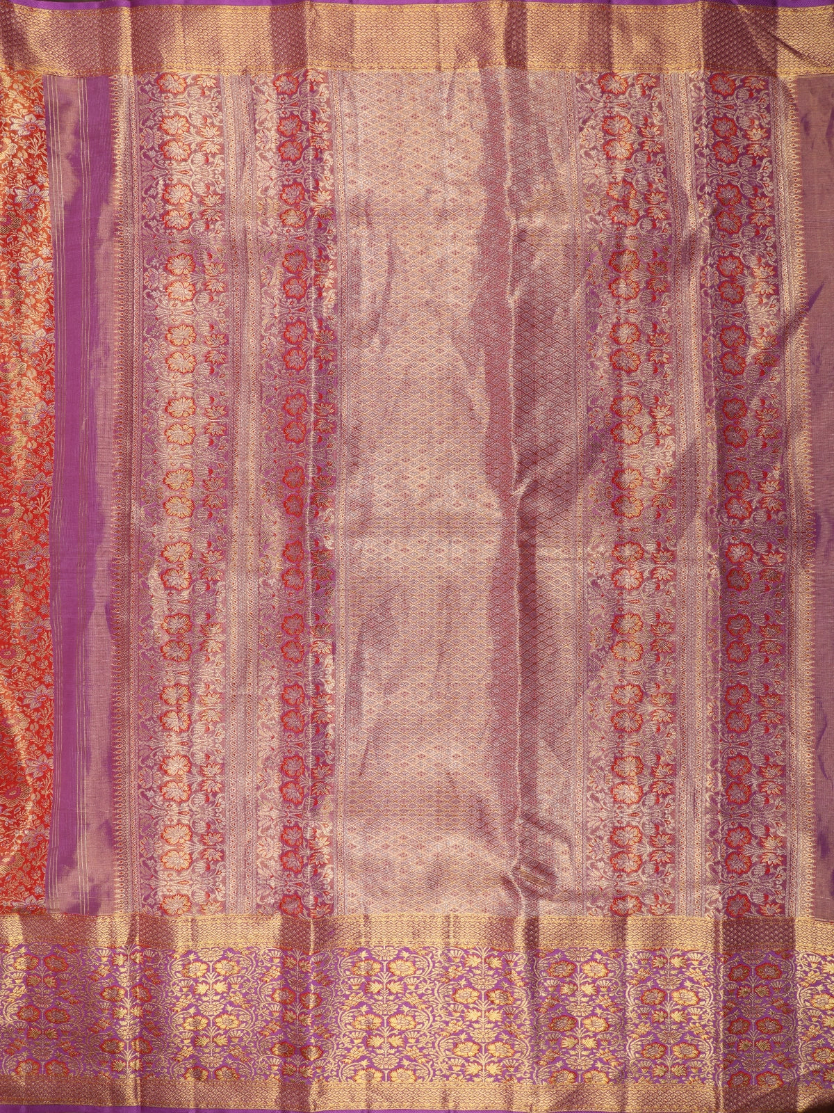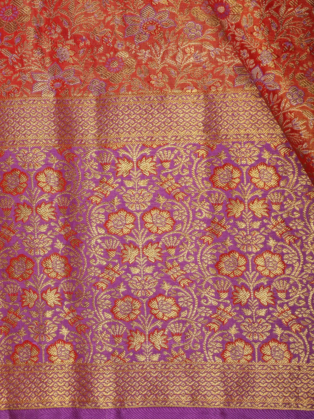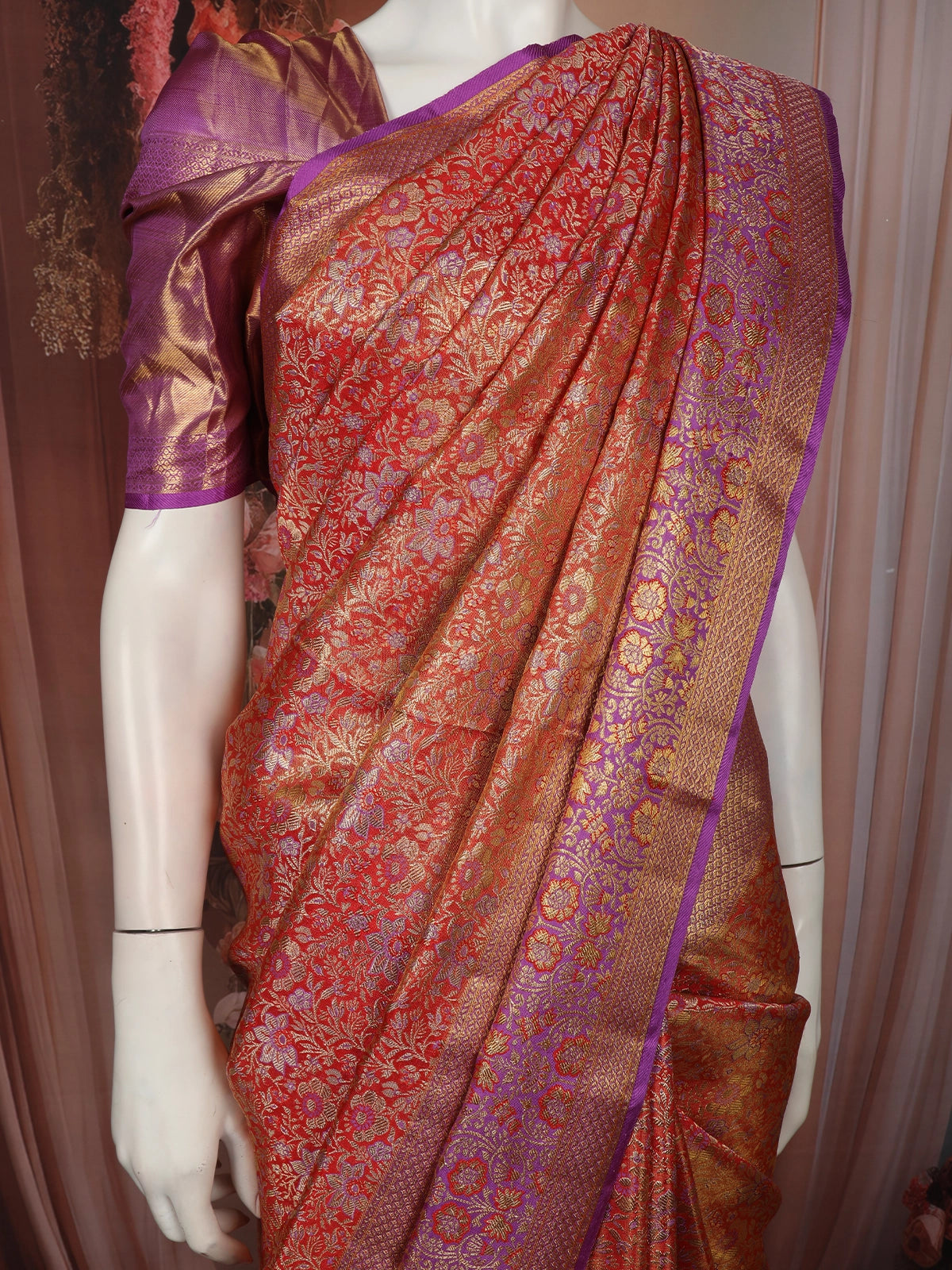 Enhancing its beauty is the stunning contrast royal purple border, richly detailed with floral zari patterns and fine geometric weaving, offering a striking and vibrant contrast. The interplay of deep red, royal purple, and lustrous gold gives the saree a majestic and festive appeal, ideal for weddings, traditional ceremonies, and grand celebrations.