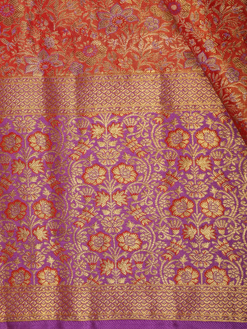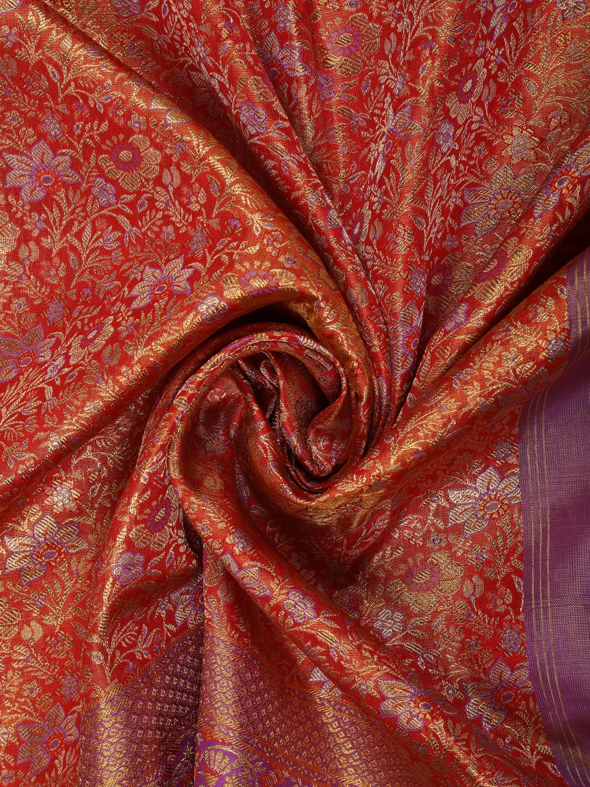 Deep Rust Red Floral Zari Woven Design Pure Kanchipuram Silk Saree with Contrast Floral Zari Border