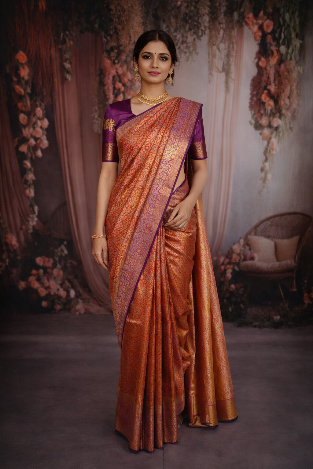 Step into timeless elegance with this exquisite Deep Rust Red Pure Kanchipuram Silk Saree, a true celebration of traditional craftsmanship and luxurious design. The saree showcases a rich rust red base intricately adorned with all-over floral zari weaving, creating a regal texture that shimmers beautifully with every movement. The delicate floral motifs, woven in antique gold zari, add depth and grandeur, making it a perfect choice for special occasions.