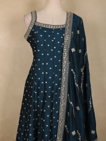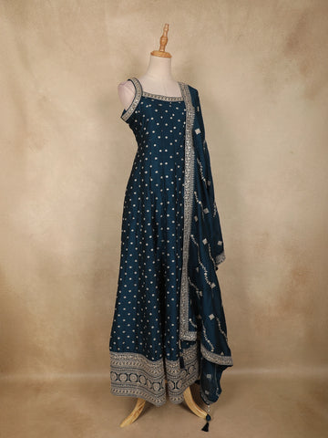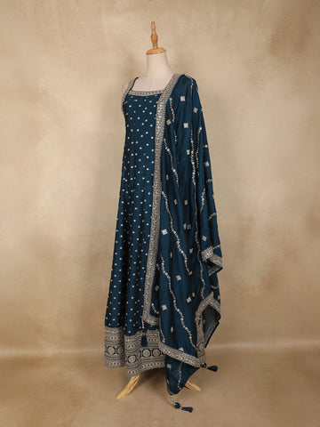 Deep Teal Blue Dotted and Floral Embroidered Design Georgette Gown with Dupatta