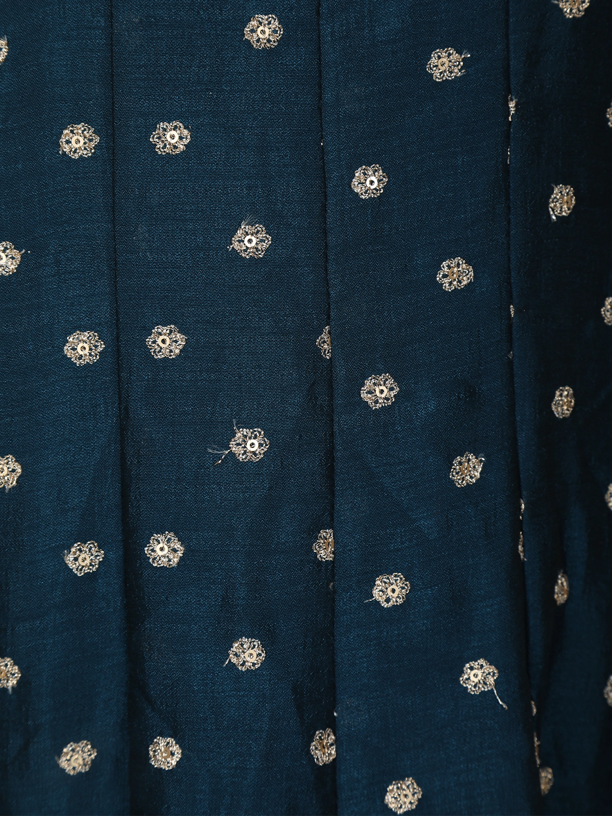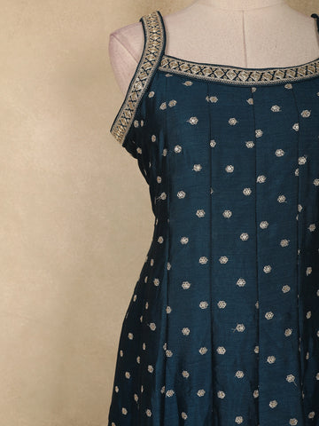 Elegant and effortlessly graceful, this deep teal blue georgette gown is designed to make a refined festive statement. Crafted in lightweight, flowy georgette, the gown drapes beautifully, creating a flattering silhouette with fluid movement. The bodice is adorned with delicate all-over dotted embroidery that adds subtle texture and shimmer, while the neckline is finished with intricate thread and zari detailing for a polished ethnic touch.