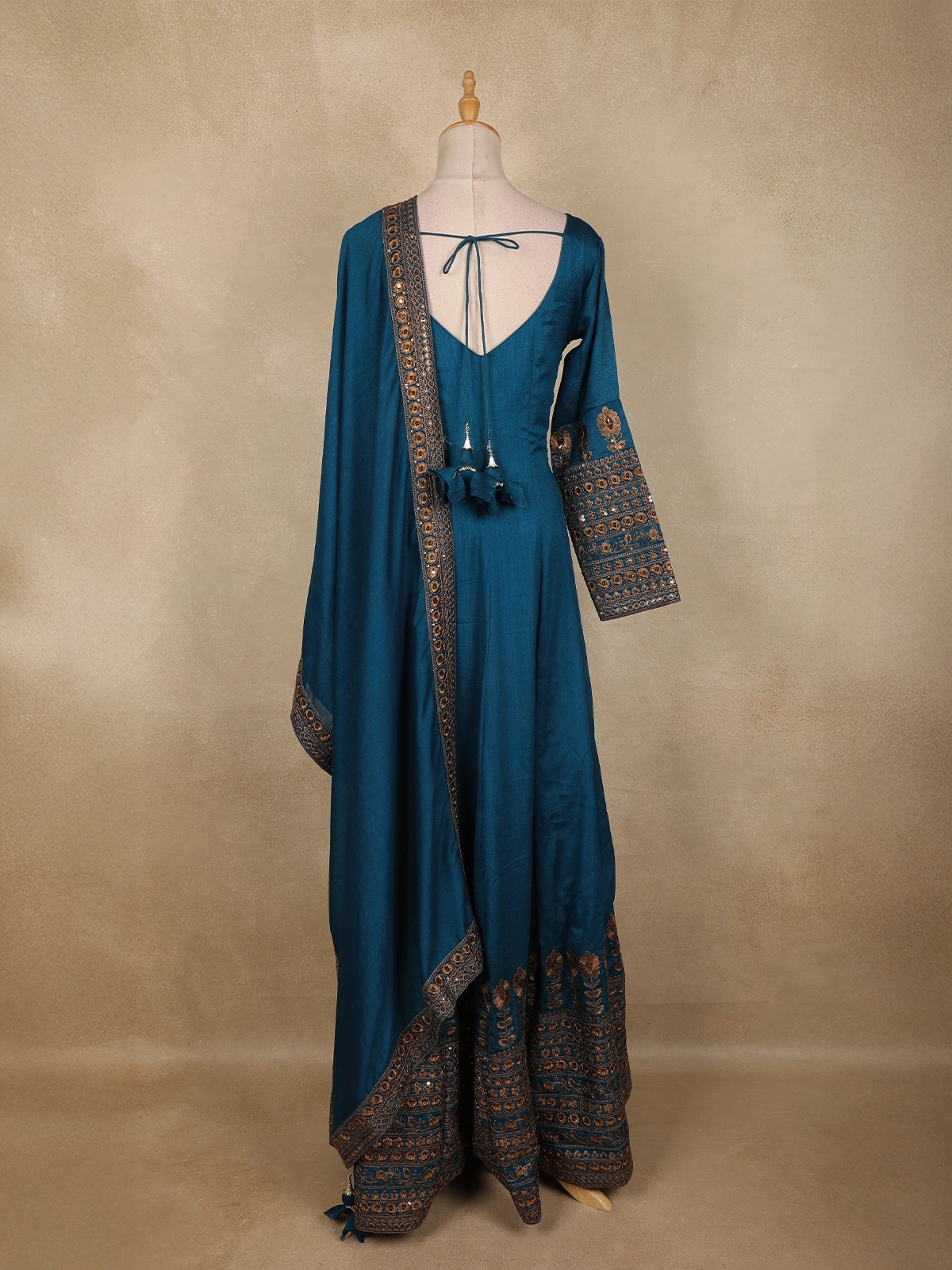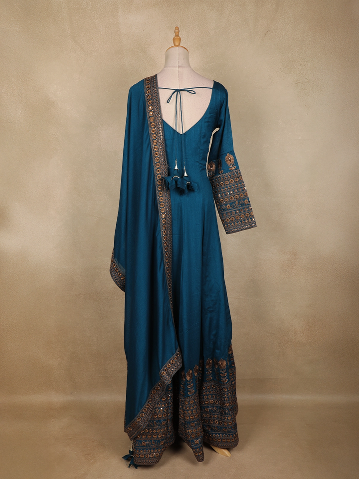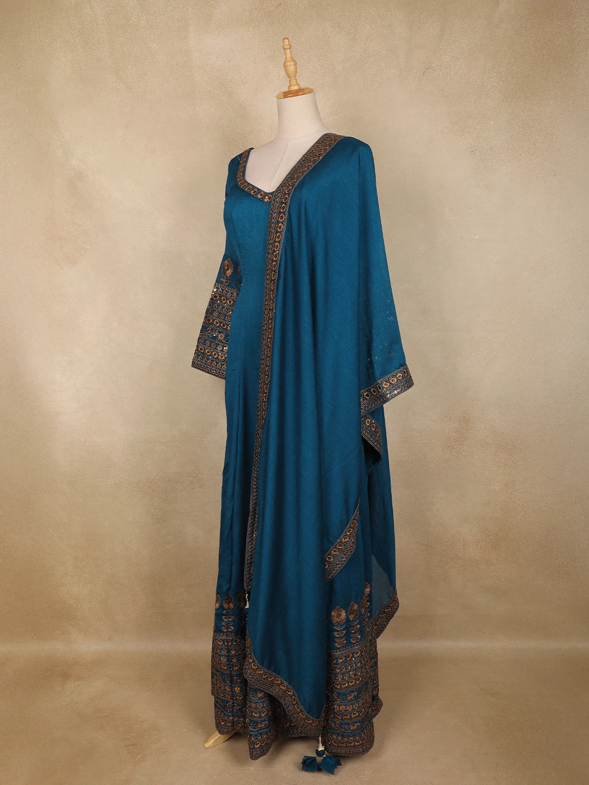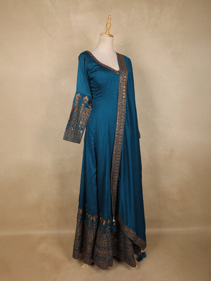 Deep Teal Blue Floral Embroidered Design Raw Silk Gown with Dupatta