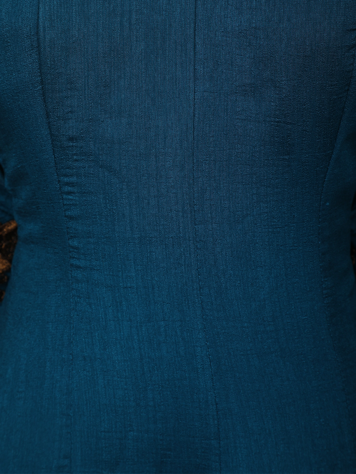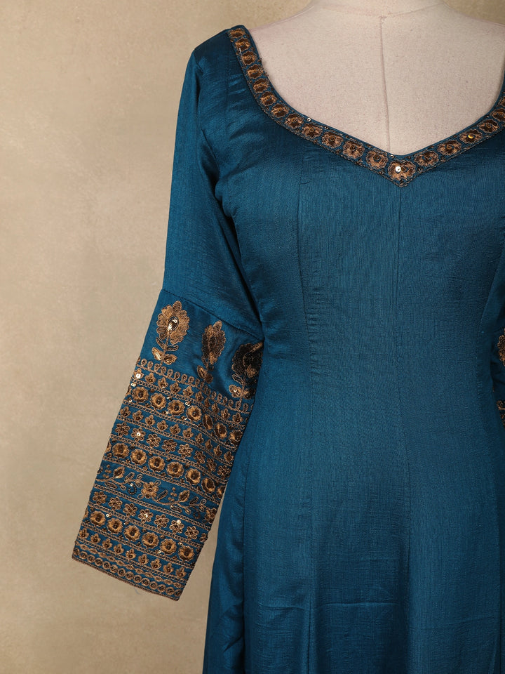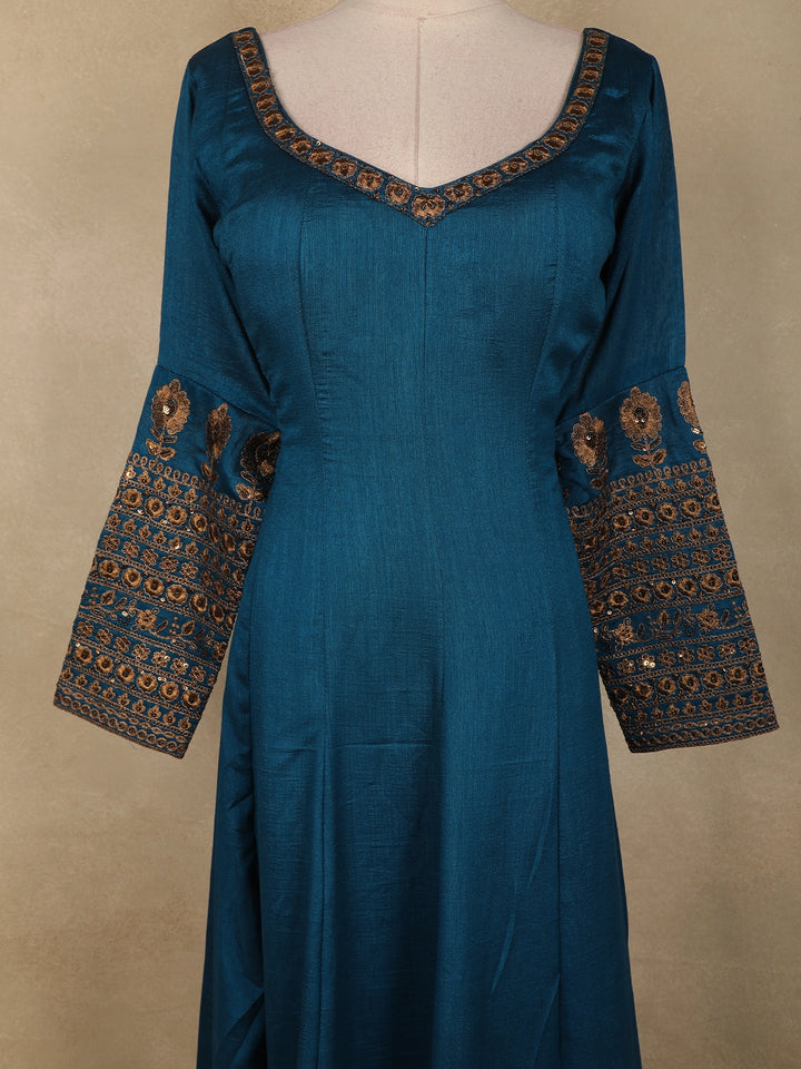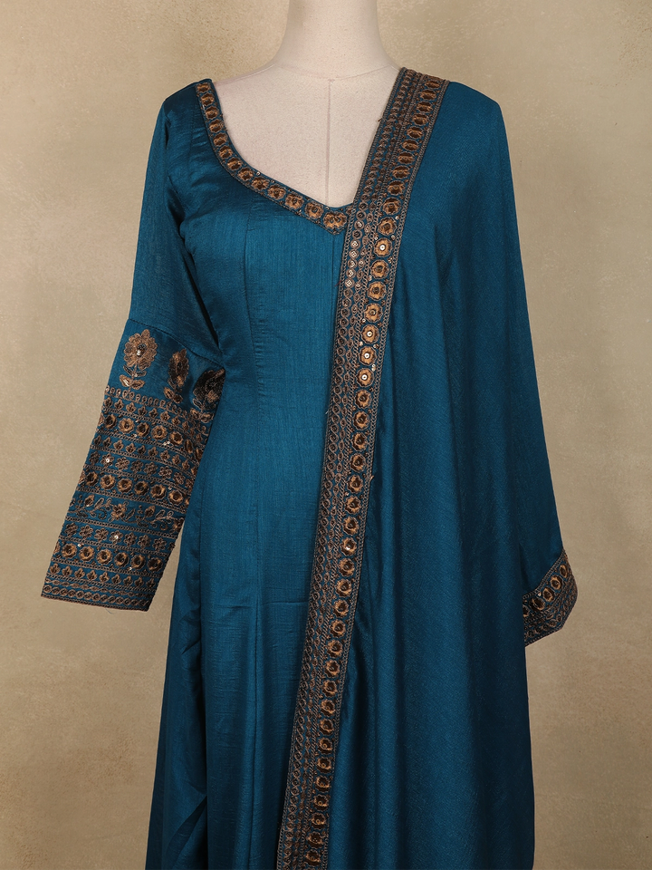 Deep Teal Blue Floral Embroidered Design Raw Silk Gown with Dupatta