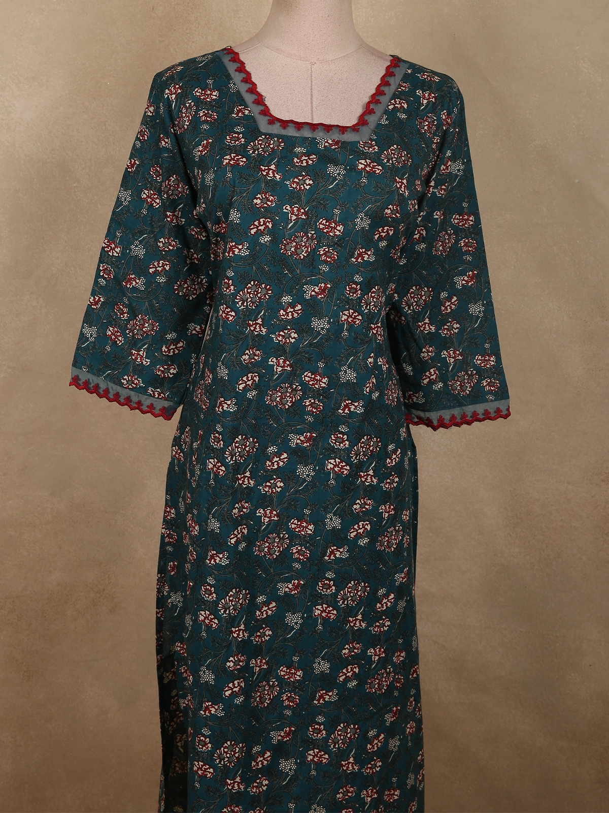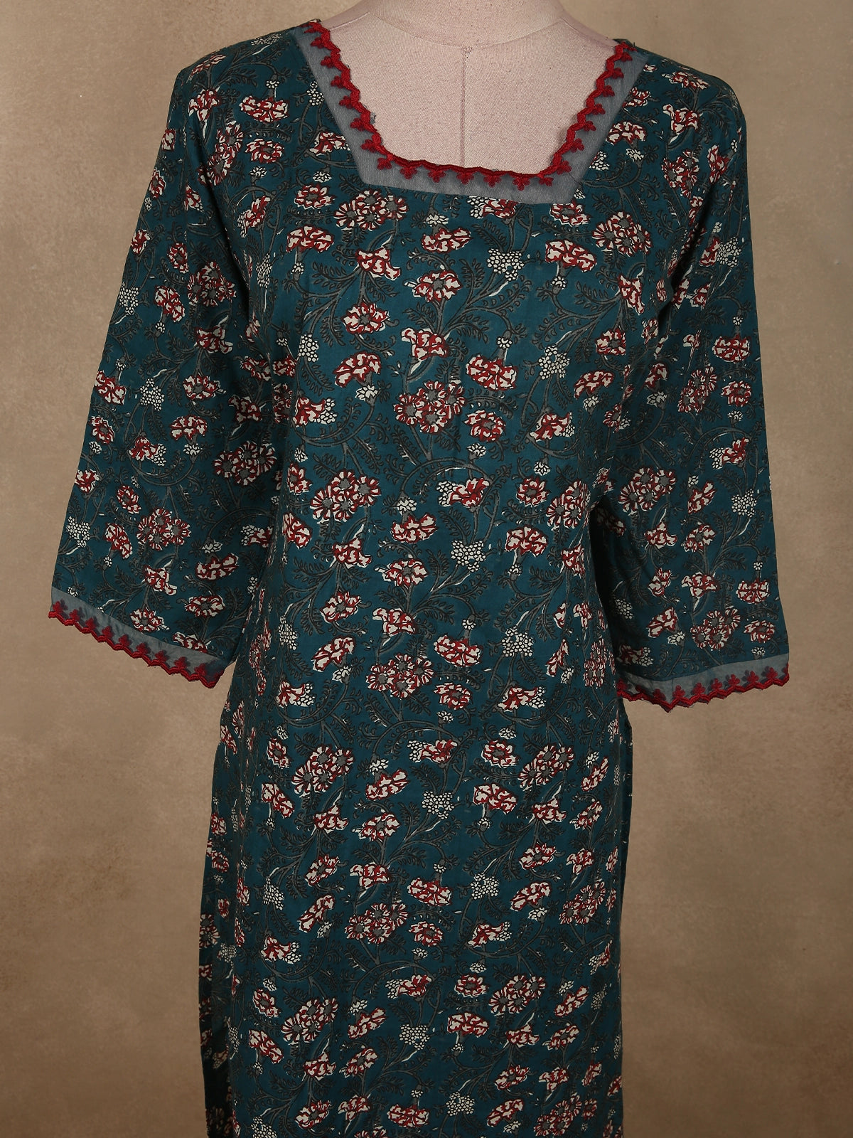 The highlight of this design is its graceful square neckline, accented with contrasting red lace detailing that adds a subtle pop of color and elevates the overall appeal. The three-quarter sleeves are finished with matching red lace trims, creating a cohesive and stylish finish. Side slits further enhance comfort and give it a classic straight-fit kurti look.